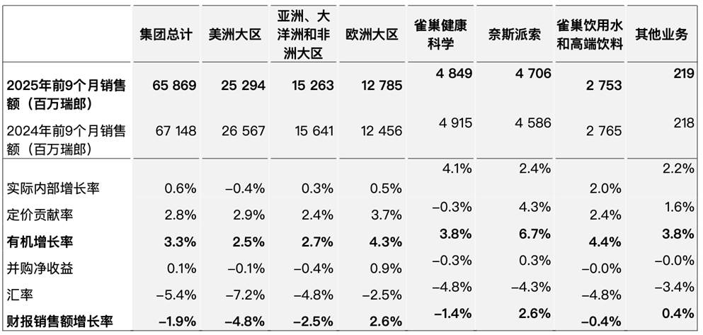 核心业绩表现 - 2025年前9个月总销售额为659亿瑞士法郎,同比下降1.9%,但有机增长率达到3.3%,较2024年同期的2.0%提升130个基点 [1] - 第三季度有机增长率跃升至4.3%,创下近期新高,实际内部增长率强劲回升至1.5% [1][3] - 有机增长由定价贡献率(2.8%)和实际内部增长率(0.6%)共同驱动,显示销量开始回暖 [2][3] 增长驱动因素 - 占总销售额10%的核心增长机遇领域有机增长率从2024年的7%飙升至14%,贡献了整体增长的60个基点 [4] - 18个此前表现欠佳的关键业务单元有机增长率从-2.5%回升至持平,贡献了40个基点的增长 [4] - 咖啡与糖果业务成为增长双引擎,在多个市场实现双位数增长,咖啡业务实际内部增长率保持正值 [4] 各业务板块与区域表现 - 奈斯派索有机增长率高达6.7%,定价贡献率达4.3%;雀巢健康科学实际内部增长率领跑,达4.1% [3][6] - 欧洲大区表现突出,财报销售额同比增长2.6%,有机增长率达4.3%,定价贡献率以3.7%领先所有大区 [3][8] - 新兴市场有机增长率为5.2%,显著高于发达市场的2.1%,主要受定价驱动 [8][9] 渠道与成本优化战略 - 电商渠道有机增长率达13.2%,占集团总销售额比重突破20.2%;居家外渠道有机增长6.2%,零售渠道增长3.1% [6] - 集团将成本节约计划目标从25亿瑞士法郎上调至30亿瑞士法郎,预计2027年底达成,通过优化1.6万个岗位每年可节省10亿瑞士法郎 [7] - 所有节省资金将定向投入创新与高增长领域,公司已在全球布局6个创新重大项目 [7] 市场反应与未来展望 - 由于业绩好于预期,公司股价在财报发布日飙升8.2%,创下2008年以来最大单日涨幅 [11] - 公司维持2025年展望,预计有机销售额增长将比2024年有所改善,2025年基本交易营业利润率将达到或高于16% [9] - 公司明确2025年自由现金流目标超80亿瑞士法郎,2026年起增速将高于股息增速 [10]