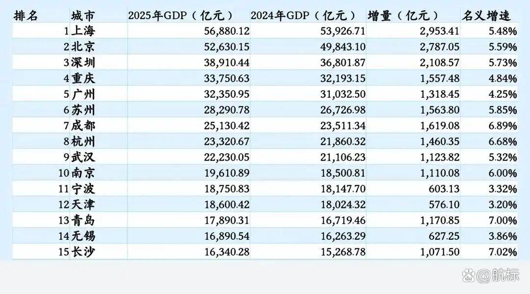 2025年中国城市GDP15强榜单核心观点 - 2025年中国城市GDP15强榜单反映出区域战略纵深与城市发展动能的同频共振 政策红利正沿着交通干线、产业集群向核心城市汇聚 榜单变化揭示了各城市独特的“增长密码”[1] 各城市GDP排名与关键数据 - **上海**以56,880.12亿元的GDP位居榜首 较2024年增长2,953.41亿元 名义增速5.48%[2] - **北京**GDP为52,630.15亿元 较2024年增长2,787.05亿元 名义增速5.59%[2] - **深圳**GDP为38,910.44亿元 较2024年增长2,108.57亿元 名义增速5.73%[2] - **重庆**GDP为33,750.63亿元 距3.4万亿仅一步之遥 较2024年增长1,557.48亿元 名义增速4.84% 坐稳第四位[1][2] - **广州**GDP为32,350.95亿元 较2024年增长1,318.45亿元 名义增速4.25%[2] - **苏州**GDP为28,290.78亿元 较2024年增长1,563.80亿元 名义增速5.85%[2] - **成都**GDP为25,130.42亿元 较2024年增长1,619.08亿元 以6.89%的增速领跑头部城市[1][2] - **杭州**GDP为23,320.67亿元 较2024年增长1,460.35亿元 名义增速6.68%[2] - **武汉**GDP为22,230.05亿元 较2024年增长1,123.82亿元 名义增速5.32%[2] - **南京**GDP为19,610.89亿元 较2024年增长1,110.08亿元 名义增速6.00%[2] - **宁波**GDP为18,750.83亿元 较2024年增长603.13亿元 名义增速3.32% 超过天津跻身第11位[1][2] - **天津**GDP为18,600.42亿元 较2024年增长576.10亿元 名义增速3.20%[2] - **青岛**GDP为17,890.31亿元 较2024年增长1,170.85亿元 名义增速7.00%[2] - **无锡**GDP为16,890.54亿元 较2024年增长627.25亿元 名义增速3.86%[2] - **长沙**GDP为16,340.28亿元 较2024年增长1,071.50亿元 名义增速7.02%[2] 重庆的增长动力:枢纽与制造 - 在成渝地区双城经济圈政策框架下 西部陆海新通道的“硬联通”成为增长杠杆 重庆集结中心货物吞吐量同比增长35% 渝新欧班列开行量突破5000列[2] - 基础设施改善降低了产业成本 例如使长安汽车的新能源整车出口成本直接降低12%[2] - 长安汽车在两江新区的智能工厂新增20万辆纯电产能 全年拿下超1800项智能网联专利 直接带动汽车产业增加值增长8.2%[2] - “枢纽+制造”的协同发展模式 使其与广州的GDP差距缩小近200亿元[2] 成都的增长动力:创新与绿色 - 天府国际机场货运吞吐量实现42%的增幅 助力打通全球供应链[4] - 创新驱动产业发展 本土药企科伦药业今年获批3款创新药 直接拉动生物医药产业营收突破千亿元[4] - 字节跳动西部研发中心落地后 仅上半年就新增2000名AI研发人员 带动数字经济核心产业增加值占比升至18.5%[4] - 在实现高速增长的同时兼顾绿色发展 工业能耗下降3% 高新技术企业数量增长22%[4] 宁波的增长动力:港口与制造 - 宁波舟山港今年集装箱吞吐量突破4000万标箱 海铁联运量增长28%[6] - 智慧港口建设提升效率 梅山港区无人集卡使用率达60% 使本地海天精工的机床出口效率提升30%[6] - 高端装备制造产业受益 全年产值增长12%[6] - 获得浙江共同富裕示范区的产业扶持资金支持 其中15%投向新能源材料项目 例如容百科技的正极材料产能扩大一倍[6] - “港口+制造”的协同模式 使其在长三角竞合中实现“错位突围”[6]