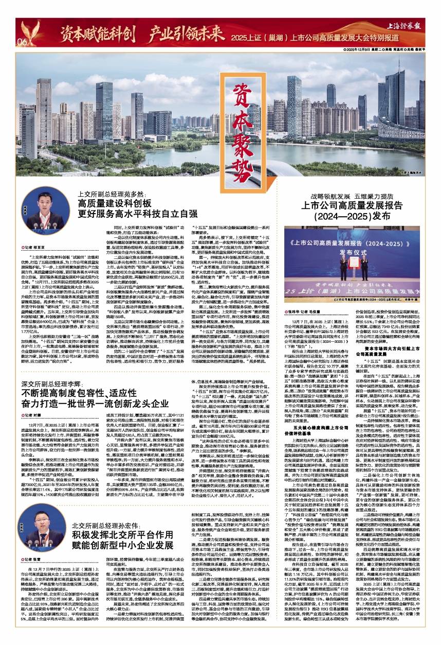 12月7日,在2025上证(巢湖)上市公司高质量发展大会上,深交所副总经理李辉表示,深交所将持续优化发行上市、并 购重组、再融资等制度机制,不断提高制度包容性、适应性,着力完善市场功能,大力培育符合新质生产力发展方向的上 市公司群体,奋力打造一批世界一流创新龙头企业。 O记者 祁夏夏 上交所着力发挥科创板"试验田"功能意 优势,打造了五级动能体系,为上市公司高质量发 限保整学前, 下一步, 上交所将兼用新加生产力发 展方向,高级国建设科创板,更好服务高术平台 自立目强,更好服务高质量发展和中国国际机构 全局、" 12月7日,上空所副总经理或多数在2 上证(期因)上市公司高质量发展大会上表示 上市公司品则持创新的地区 E和产业绩和 升级的市力量,最高太市场服务高质量分展的形 要教观基础。列多熬介绍,"十四五" 期间,上充 所坚守科创板"硬科技" 定位,推动上市公司加 量時被式提升,五年泉,上交所引导资金加快向 和创新城汇聚 利创新新媒上市公园381家 首发 重要总裁达8400亿元,已度为"感到我"全面 市首选地;单先推出科技创新债券,累计发行业 1.7万亿元。 上交所也积极助力安徽省"三地一区"战略 加快赢拍_ ...