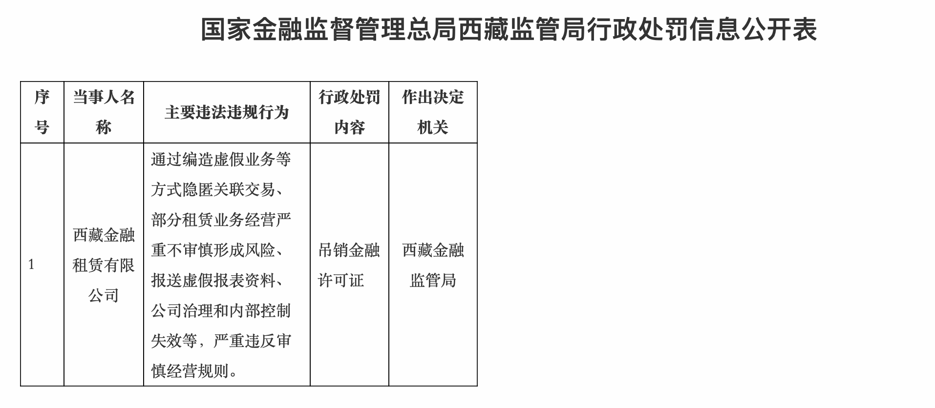 21世纪经济报道记者 郭聪聪 北京报道 21世纪经济报道记者注意到,4月29日,国家金融监督管理总局西藏监管局在其官网发布的一则行政处罚信息公开表显示,西藏金租存在通过编造虚假业务 等方式隐匿关联交易、部分租赁业务经营严重不审慎形成风险、报送虚假报表资料、公司治理和内部控制失效等多项违法违规行为,严重违反审慎经营规 则,该局决定吊销西藏金租金融许可证。 一纸行政处罚决定,宣告了西藏金融租赁有限公司(下称"西藏金租")的终结,这家曾经创造"两年破百亿"规模奇迹的金租公司,最终因财务造假、违规经 营等问题走向末路。 (西藏金租股东信息 来源:企业预警通) 凭借政策红利和股东背景,西藏金租实现了"两年破百亿"的规模奇迹——资产规模在短短两年内突破百亿元,业务范围迅速覆盖航空、能源、基建等多个资 金密集型领域。然而,在超常规发展背后往往隐藏着致命隐患,西藏金租的商业模式存在着三大结构性缺陷: | 序 | 当事人名 | 主要违法违规行为 | 行政处罚 | 作出决定 | | --- | --- | --- | --- | --- | | 島 | 称 | | 内容 | 机关 | | | 西藏金融 租賃有限 | | | 西藏 ...