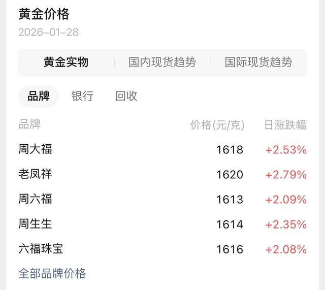 黄金市场价格表现 - 2026年1月以来,国际金价累计上涨已超过880美元,年内涨幅超20% [1] - 分析师年初预测金价突破5000美元/盎司的目标已被突破,下一个目标是6400美元/盎司 [1] - 2026年1月28日,国内主流金饰品牌报价首次突破1600元/克大关,周生生足金饰品报价升至1614元/克,老庙黄金报价1612元/克,均较前一日大幅上调约37元 [1] - 2026年1月23日,国内多数品牌金饰报价刚刚突破1540元/克,短短数日涨幅惊人 [1] - 回顾2026年年初,金饰价格尚在1345-1360元/克区间,年内每克上涨已超230元 [1] - 2026年1月28日,周大福金饰价格为1618元/克,日涨跌幅+2.53%;老凤祥为1620元/克,日涨跌幅+2.79%;周六福为1613元/克,日涨跌幅+2.09%;周生生为1614元/克,日涨跌幅+2.35%;六福珠宝为1616元/克,日涨跌幅+2.08% [2] 市场情绪与分析师观点 - 当前黄金市场正处于“所有指标都可能失灵”的状态,市场情绪普遍看涨 [1] - 分析师提醒,虽然长期看涨趋势明显,但短期暴涨同样伴随着暴跌风险 [1] - 分析师建议以“储备资产”的心态购买黄金,而不是以炒作心态进入市场 [3] - 对于普通家庭,分析师建议家庭黄金储备宜在50克至100克之间,低于100克的持有量应视为家庭必备资产,没有必要因为价格高涨而卖出 [4] - 对于已持有较多黄金的投资者,分析师建议可分批卖出部分获利,但切忌清仓 [4] 上涨驱动因素 - 本轮黄金上涨的核心逻辑已超越了传统的避险交易范畴 [4] - 上涨是短期、中期、长期三重逻辑共振的结果:短期受地缘政治风险溢价驱动;中期受美联储政策路径博弈影响;长期则根植于美元信用体系的结构性弱化 [4] - 全球央行持续增持黄金以优化储备结构,以及长期投资者将黄金作为核心配置,共同构成了金价的坚实支撑 [4] 相关市场表现 - 受金价强势带动,A股黄金概念股表现活跃,2026年1月28日,中国黄金实现4连板,湖南黄金收获3连板,其他多家黄金公司股价均显著上涨 [2] - 对于同样表现强势的白银,分析师态度更为谨慎,指出白银市场容量小,缺乏黄金那样的金融属性支撑,更多是工业需求为主,过度的投机会导致暴涨暴跌 [3] 行业风险与警示 - 一款名为“畅购商城”的APP以“低价黄金”为诱饵实施诈骗,涉案金额初步统计达2500万元,其中单人最高损失近90万元 [5] - 该APP通过秒杀活动,以比市价低30-40元/克的价格吸引消费者,在成功完成小额交易获取信任后,收取大额资金后失联 [5][6] - 该APP能从正规手机应用商店下载,且付款通过正规支付平台完成,增强了欺骗性 [6] - 律师指出该行为已涉嫌诈骗罪且数额特别巨大,建议受害者联合维权并谨慎对待网络上所谓的“维权中介” [6] - 在我国,黄金资产管理业务仅限银行、信托、证券、基金、期货、保险资产管理机构、金融资产投资公司等持牌金融机构开展,任何黄金珠宝公司、门店声称开展“理财”“托管”业务,均属超范围经营,涉嫌非法 [6]
