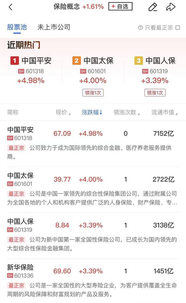 最近,中国平安股价持续走强。今天上午,中国平安上涨4.98%,盘中股价创2021年4月以来新高,最新市值为1.21万亿元,居Wind证券人气榜A股第一 名。此外,中国人寿上午上涨2.1%,盘中股价创今年以来新高。 2020年11月30日,中国平安盘中股价创历史新高,之后,股价持续回调,2022年10月31日盘中股价创出多年新低。在这期间,"珍惜XX元的中国平安"成 为网络流行语。 保险、大消费、钢铁等板块上午走强,科技股回调。截至上午收盘,上证指数下跌0.11%,深证成指下跌0.71%,创业板指下跌1.29%。 保险板块大涨 12月5日,国家金融监督管理总局发布《关于调整保险公司相关业务风险因子的通知》,进一步释放险资入市空间。华西证券表示,对行业而言,《通 知》适度放松保险公司资本监管,缓解了保险公司的资本压力,推动行业稳健经营。对于具体险企而言,《通知》对股票投资占比较高的大型保险公司有 望形成持续利好。 今天上午,保险板块大涨,中国平安、中国太保等个股领涨。 | 中国平安 融 601318 | 67.09 | 4.98% | 7152亿 | | --- | --- | --- | --- | | 行业龙 ...