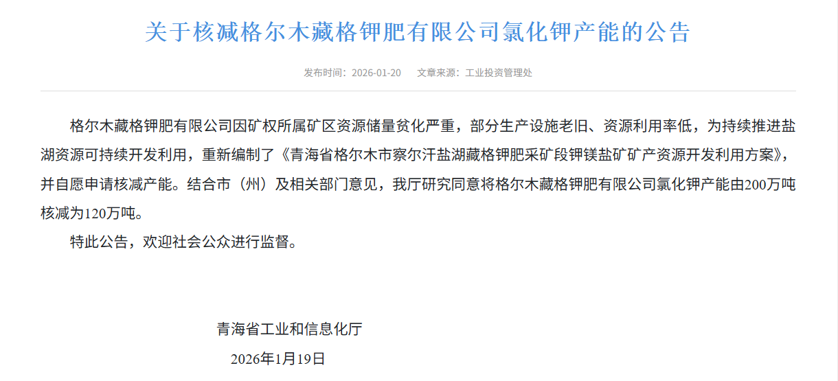 人民财讯1月20日电,青海省工业和信息化厅今日发布《关于核减格尔木藏格钾肥有限公司氯化钾产能的公告》。公告显示,格尔木藏格钾肥有限公司因矿 权所属矿区资源储量贫化严重,部分生产设施老旧、资源利用率低,为持续推进盐湖资源可持续开发利用,重新编制了《青海省格尔木市察尔汗盐湖藏格钾 肥采矿段钾镁盐矿矿产资源开发利用方案》,并自愿申请核减产能。结合市(州)及相关部门意见,青海省工业和信息化厅研究同意将格尔木藏格钾肥有限公 司氯化钾产能由200万吨核减为120万吨。 ...