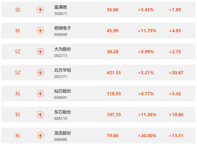半导体芯片股市场表现 - 11月18日早盘半导体芯片股逆势拉升 龙迅股份触及涨停 明微电子和东芯股份涨幅超过10% [1] - 富满微股价36.60元 涨幅5.45% 北方华创股价421.55元 涨幅5.21% 灿芯股份股价118.93元 涨幅4.77% [2] - 大为股份股价30.28元 涨幅9.99% 龙迅股份股价79.86元 涨幅20.00% [2]