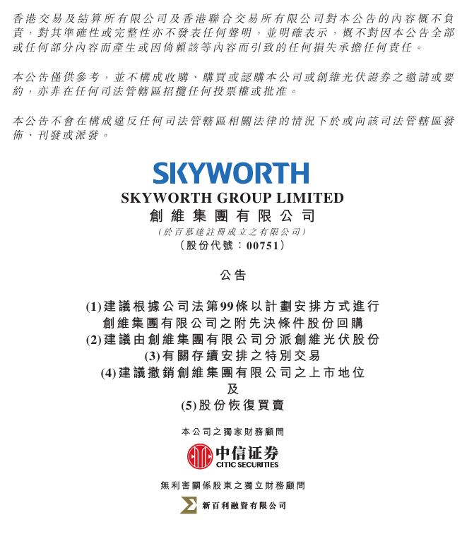 行业技术动态 - 第十二届太阳电池浆料与金属化技术论坛将于2026年3月19日在江苏常州召开 会议将探讨光伏行业展望 异质结 TOPCon XBC电池技术与金属化工艺 LECO激光设备与先进银浆 激光转印 全开口钢版 铜浆 银包铜 铝浆 铜电镀 无主栅技术与应用 晶硅-钙钛矿叠层电池金属化工艺与浆料技术展望等[1][5] - 第八届钙钛矿与叠层电池论坛将于2026年4月15-16日在常州召开 会议将探讨光伏行业展望与钙钛矿和叠层电池市场 大面积工业化钙钛矿电池材料体系 制造工艺与核心设备 钙钛矿与叠层电池良率和转换效率提升 成本降低与长期稳定性研究 两端 三端和四端叠层组件技术研发与结构设计 钙钛矿与叠层组件封装技术与封装材料 以及其在BIPV 消费电子 可穿戴设备 新能源汽车 分布式电站和大型地面电站的应用方案等[1][5] 创维集团资本运作 - 创维集团董事会于2026年1月4日决议 在满足先决条件的前提下 提出分派创维光伏股份及申请其上市 进行股份回购计划以撤销上市地位等建议 公司股份自2026年1月21日上午9时起恢复在联交所买卖[1] - 根据建议 公司将向全体股东分派所持创维光伏股份 创维光伏将申请以介绍方式在联交所主板上市[1][3] - 公司将通过计划安排进行股份回购 注销计划股份 计划股东可选择每股计划股份获4.03港元现金或1股新股份 分派 创维光伏上市及股份回购的完成互为条件 将同日或大致同日发生[3] 创维光伏业务与财务表现 - 创维光伏成立于2020年 隶属于创维集团 公司以“光伏+普惠+数字科技”为商业模式 致力于成为全球领先的分布式光伏产品和服务提供商 已实现双品牌 多业务 多模式的全球化战略布局 业务涵盖分布式光伏电站系统集成解决方案 光伏产品智能制造 储能 运维 物流 海外及投资等新能源业务[4] - 2022年至2024年及2025年上半年 创维光伏营业额分别为119.30亿元 232.17亿元 201.46亿元 137.76亿元 净利润分别为3.56亿元 8.65亿元 7.93亿元 5.32亿元[4] 资本运作动因与战略考量 - 创维集团传统家电业务增长放缓 而创维光伏作为新能源业务核心 已成为营收与利润主要增长引擎 独立上市可释放其增长潜力并拓宽融资渠道[4] - 创维集团当前估值未能充分反映资产价值 私有化后剩余业务(家电 智能系统等)可由核心股东集中管理 以进一步优化运营效率[4]