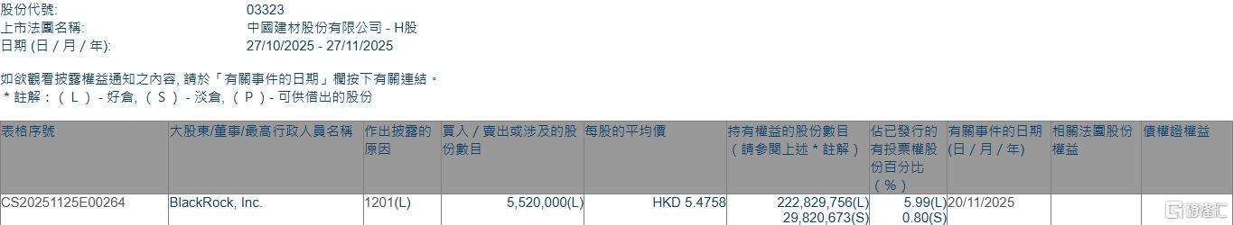 | 股份代號: | 03323 | | --- | --- | | 上市法國名稱: | 中國建材股份有限公司 - H股 | | 日期 (日 / 月 / 年): | 27/10/2025 - 27/11/2025 | 格隆汇11月27日丨根据联交所最新权益披露资料显示,2025年11月20日,中国建材(03323.HK)遭BlackRock, Inc.在场内以每股均价5.4758港元减持好仓552万 股,涉资约3022.64万港元。 减持后,BlackRock, Inc.最新持好仓数目为222,829,756股,持好仓比例由6.14%下降至5.99%。 | 豪格序號 | 大股東/董事/最高行政人員名稱 作出披露的 買入 / 賣出或涉及的股 每股的平均價 | | | | 持有權益的股份數目 佔已發行的 有關事 | | --- | --- | --- | --- | --- | --- | | | 份數目 | 原因 | | | (請參閱上述*註解) 有投票權股 (日 / 月 | | | | | | | 份自分比 | | | | | | | ( % ) | | CS20251125E00264 | BlackRock ...