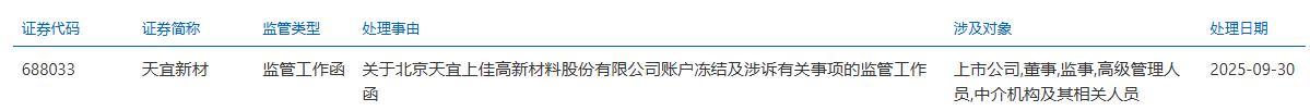 中国经济网北京10月9日讯 上交所官网显示,上交所对北京天宜上佳高新材料股份有限公司(简称"天宜新材",688033.SH)出具监管工作函。监管工 作函处分日期为9月30日,处理事由为关于北京天宜上佳高新材料股份有限公司账户冻结及涉诉有关事项。 | 证券代码 | " 让 让 " 让 " | 监管类型 | 涉及对象 | | --- | --- | --- | --- | | 688033 | 天直新材 | | 监管工作函 关于北京天宜上佳高新材料股份有限公司账户冻结及涉诉有关事项的监管工作 上市公司,董事,监事,高级管理人 | | | | reli | 日十六初始及昔妇子 三 | 天宜新材10月1日发布关于公司银行账户被冻结及涉及诉讼的进展公告。截至公告披露日,天宜新材及子公司银行账户受限金额合计为13,351.88万 元,占公司2024年末经审计净资产的3.64%,占公司2025年半年度末净资产的3.86%,占公司2024年末经审计货币资金的50.05%,占公司2025年半年度末 货币资金的74.52%。其中,被冻结金额合计7,880.38万元,银行账户处于止付状态金额合计5,471.50万元。 募集资金专户 ...