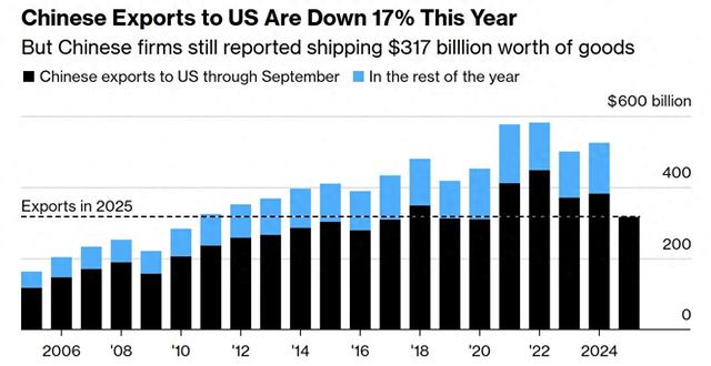 报道还称,今年第三季度(7至9月),中国对美出口商品价值超1000亿美元,这帮助中国保持经济增 长、实现年度目标,双边贸易顺差达到近670亿美元。根据美国人口普查局官网数据,去年同期数据为 1236.305亿美元。 【文/观察者网 阮佳琪】 当地时间10月22日,美媒彭博社报道称,美国总统特朗普悍然挑起贸易战已逾半年,但中国出口展现出 的强劲韧性表明,其诸多产品对美国仍不可或缺。这也让中国在接下来的中美贸易谈判中拥有更大议价 能力。 据报道,中国每天仍有价值约10亿美元的货物跨太平洋运往美国,且9月出口额较8月有所回升。尽管过 去半年,中美整体贸易额降幅达两位数,但部分产品近期的出口量较2024年反而出现增长,顶住了两国 间的贸易紧张局势。 彭博社分析认为,这一现象表明,因为中国在稀土、电子等领域的影响力使其产品难以被替代,美国关 税在限制本国企业进口方面的作用似乎较为有限。 彭博社经济学家Chang Shu与David Qu表示,中国在全球供应链中的强势地位,使其在短期内对美国进 口商拥有一定程度的议价能力。他们同时警告称,其他国家无法迅速取代中国成为美国的供应方,因 为"供应链的重组需要时间"。 黑色部分 ...