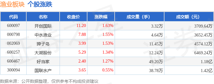 板块整体表现 - 渔业板块在10月10日整体上涨1.26%,表现强于大盘,当日上证指数下跌0.94%,深证成指下跌2.7% [1] - 板块内个股普涨,领涨股为开创国际,涨幅为1.63% [1] - 板块整体资金面呈现分化,主力资金净流出1744.19万元,而游资和散户资金分别净流入921.71万元和822.48万元 [1] 个股价格与成交表现 - 开创国际收盘价为11.20元,涨幅1.63%,成交量为3.32万手,成交额为3709.64万元 [1] - 中水渔业收盘价为7.88元,涨幅1.55%,成交量为4.64万手,成交额为3652.45万元 [1] - 獐子岛收盘价为66元,涨幅1.53%,成交量为11.45万手,成交额为4574.12万元 [1] - 大湖股份收盘价为5.29元,涨幅1.34%,成交量为12.24万手,成交额为6469.24万元 [1] - 好当家收盘价为2.40元,涨幅1.27%,成交量为49.20万手,成交额为1.18亿元 [1] - 国联水产收盘价为3.65元,涨幅0.55%,成交量为38.78万手,成交额为1.42亿元 [1] 个股资金流向 - 好当家主力资金净流入754.64万元,主力净占比6.40%,但游资和散户资金分别净流出86.45万元和668.20万元 [2] - 獐子岛主力资金净流入21.00万元,主力净占比0.46%,游资资金净流出381.74万元,散户资金净流入360.74万元 [2] - 中水渔业主力资金净流出92.41万元,主力净占比-2.53%,游资资金净流入117.12万元 [2] - 开创国际主力资金净流出563.56万元,主力净占比-15.19%,散户资金净流入575.42万元,散户净占比15.51% [2] - 大湖股份主力资金净流出771.78万元,主力净占比-11.93%,游资和散户资金分别净流入279.33万元和492.45万元 [2] - 国联水产主力资金净流出1092.08万元,主力净占比-7.67%,游资资金净流入1005.30万元,游资净占比7.06% [2]