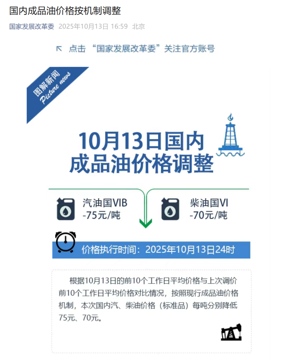 【导读】国内成品油价格按机制调整,汽、柴油每吨分别降低75元、70元 中国基金报记者 晨曦 就在今晚,油价又要下调了! 10月13日,国家发展改革委官微发布消息称,根据10月13日的前10个工作日平均价格与上次调价前10个工作日平均价格对比情况,按照现行成品油价格形 成机制,本次国内汽、柴油价格(标准品)每吨分别降低75元、70元。价格执行时间为2025年10月13日24时。 卓创资讯指出,本计价周期内(2025年9月23日24时至2025年10月13日24时),国际原油价格重心先上涨而后震荡下移。前期地缘局势冲突及OPEC+计划 增产不及预期,致原油价格出现上涨。但后期地缘溢价回吐,贸易局势紧张导致原油价格接连下调。受此影响,国内参考的原油变化率在正值范围短暂上 行后进入下行通道。 上周,布伦特原油连续合约累计下跌显著;尤其在上周五收盘时,跌幅达到了4.67%,最终定格在每桶65.16美元。这一价位是布伦特原油自今年5月以来 从未触及的低点。 美原油连续合约(WTI)的跌势同样明显,体现了北美市场对于短期需求的悲观预期。盘中,WTI价格一度跌破60美元关口,最低触及每桶58.22美元, 显示出市场恐慌情绪的 ...