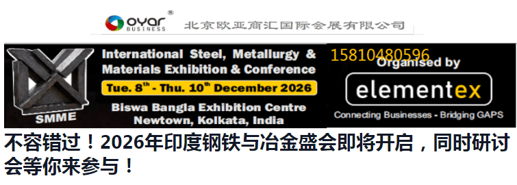 2026年印度国际钢铁、冶金与材料展览会及研讨会 (International Steel, Metallurgy & Materials Exhibition & Conference2026) 展会时间:2026年12月8--10日 展会地点:印度加尔各答(Biswa Bangla Exhibition Centre会展中心) 组 委 会:ELEMENTEX 展会周期:一年一届 组展158单位北京欧亚1048商汇国际会展有限0596公司 与会者主要为冶金钢铁专家、冶金钢铁设备制造商、采矿设备制造商以及行业分析专家和进出口贸易商等。因此,这将是冶金、钢铁及金属领域的一 次盛会。支持单位有:印度感应熔炉协会,印度矿业联盟,印度铜业发展中心,印度铅锌发展协会,东南亚钢铁学会,澳大利亚矿业与冶金学会, SIDREX,TMS。 自2020年以来,时隔6年,印度终于放开对华签证。这一举动对于促进中印经济贸易起到了至关重要的影响。2026年中印经济往来频率将大幅度提 升,北京欧亚商汇国际会展有限公司将和您一起开拓印度市场。 市场分析:印度的钢铁行业十分强劲,发展势头迅猛。到 2025 年,印度将成为全球第二大钢铁生产国 ...