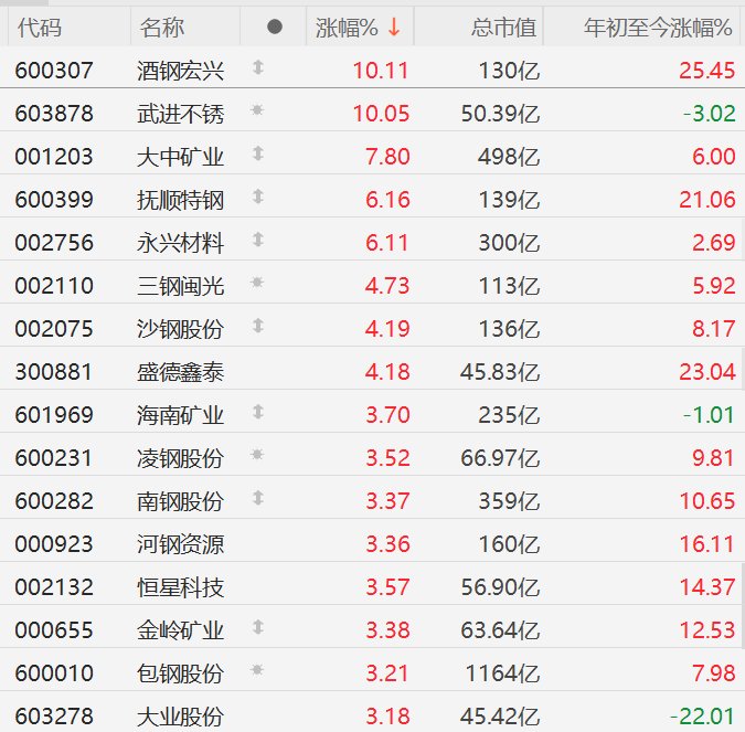 1月23日,A股市场钢铁股午后涨幅扩大,其中,酒钢宏兴、武进不锈拉升10CM涨停,大中矿业涨超 7%,抚顺特钢、永兴材料涨超6%,三钢闽光、沙钢股份、盛德鑫泰涨超4%, | 代码 | 名称 | | 涨幅% ↓ | 总市值 | 年初至今涨幅% | | --- | --- | --- | --- | --- | --- | | 600307 | 酒钢宏兴 | 1 | 10.11 | 130亿 | 25.45 | | 603878 | 武进不锈 | 米 | 10.05 | 50.39亿 | -3.02 | | 001203 | 大中矿业 | 1 | 7.80 | 498亿 | 6.00 | | 600399 | 抚顺特钢 | 1 | 6.16 | 139亿 | 21.06 | | 002756 | 永兴材料 | 1 | 6.11 | 300亿 | 2.69 | | 002110 | 三钢闽光 | -06 | 4.73 | 113亿 | 5.92 | | 002075 | 沙钢股份 | 1 | 4.19 | 136亿 | 8.17 | | 300881 | 盛德鑫泰 | | 4.18 | 45.83 乙 | 23.0 ...