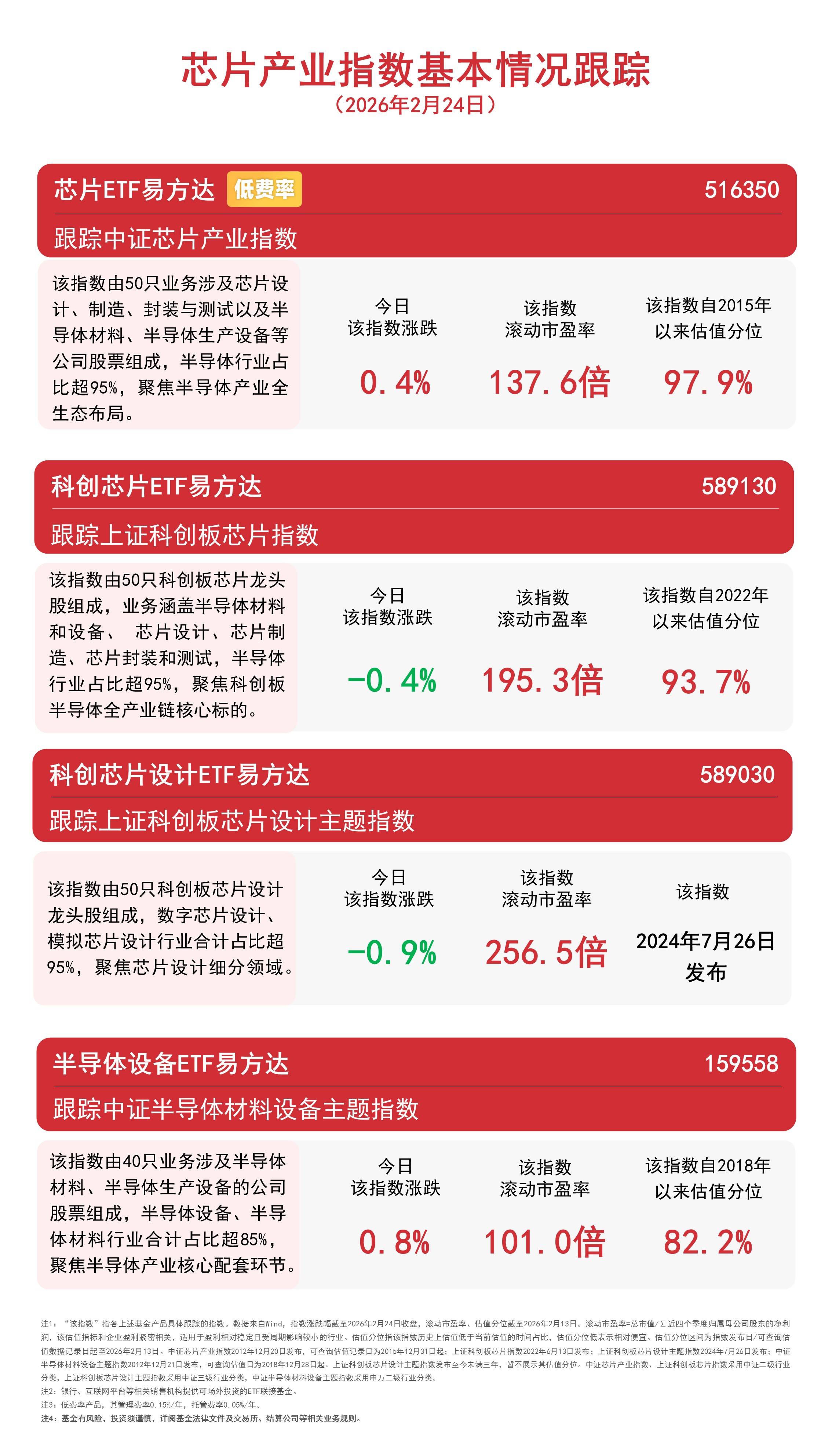 市场表现与资金流向 - 截至收盘,中证半导体材料设备主题指数上涨0.8%,中证芯片产业指数上涨0.4% [1] - 上证科创板芯片指数下跌0.4%,上证科创板芯片设计主题指数下跌0.9% [1] - 半导体设备ETF易方达(159558)近一月合计净流入额超23亿元 [1] 相关指数与ETF产品 - 半导体设备ETF易方达跟踪中证半导体材料设备主题指数 [7] - 科创芯片设计ETF易方达跟踪上证科创板芯片设计主题指数 [7] 指数成分与行业覆盖 - 上证科创板芯片指数由50只科创板芯片龙头股组成,业务涵盖半导体材料、设备、设计、制造、封装和测试,半导体行业占比超95% [5] - 上证科创板芯片设计主题指数由50只科创板芯片设计龙头股组成,数字芯片设计、模拟芯片设计行业合计占比超95% [7]