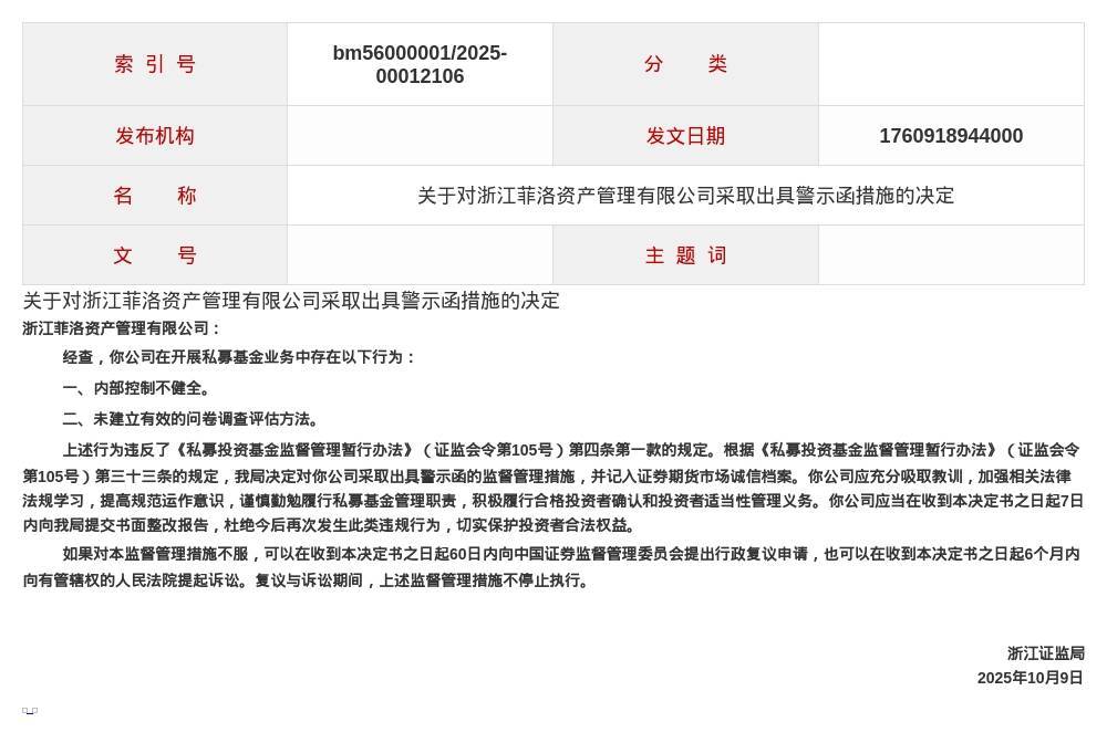 蓝鲸新闻10月20日讯,近日,浙江证监局发布了对浙江菲洛资产管理有限公司采取出具警示函措施的决定。 根据决定内容,浙江菲洛资产管理有限公司在开展私募基金业务中存在内部控制不健全、未建立有效的问卷调查评估方法的问题。这些行为违 反了《私募投资基金监督管理暂行办法》的相关规定。 针对以上问题,浙江证监局对其出具警示函的监督管理措施,并记入证券期货市场诚信档案。同时,要求该公司充分吸取教训,加强相关法律 法规的学习,提高规范运作意识,谨慎勤勉履行私募基金管理职责,积极履行合格投资者确认和投资者适当性管理义务。 | 索 引 号 | bm56000001/2025- 00012106 | સ 英 | | | --- | --- | --- | --- | | 发布机构 | | 发文日期 | 1760918944000 | | 称 ਜ | 关于对浙江菲洛资产管理有限公司采取出具警示函措施的决定 | | | | 文 号 | | 主题词 | | ...