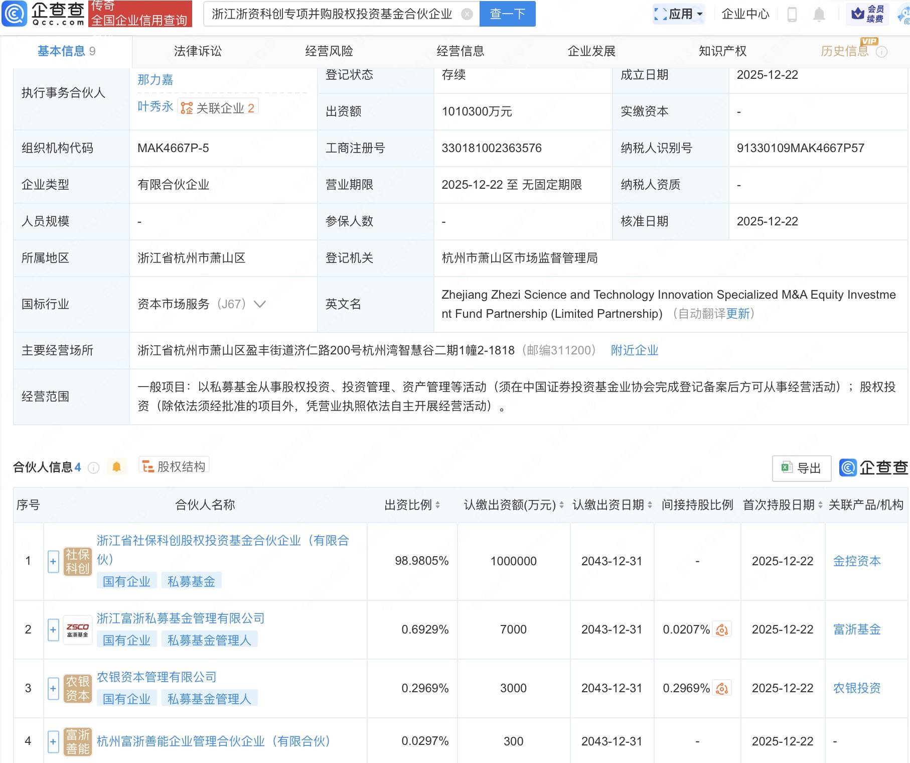 企查查APP显示,近日,浙江浙资科创专项并购股权投资基金合伙企业(有限合伙)成立,出资额101.03亿元,经营范围为以私募基金从事股权投资、投资 管理、资产管理等活动。企查查股权穿透显示,该企业由浙江省社保科创股权投资基金合伙企业(有限合伙)、浙江富浙私募基金管理有限公司等共同出 资。 合伙人信息4 1 @ E= 股权结构 | 十月日 13日 全国企业信用查询 | | 浙江浙资科创专项并购股权投资基金合伙企业 8 | 百一下 | | --- | --- | --- | --- | | 基本信息 9 | 法律诉讼 | 经营风险 | 经营信息 | | 执行事务合伙人 | 那力嘉 | 登记状态 | 存续 | | | 叶秀永 容关联企业 2 | 出资额 | 1010300万元 | | 组织机构代码 | MAK4667P-5 | 工商注册号 | 330181002363576 | | 企业类型 | 有限合伙企业 | 营业期限 | 2025-12-22 至 无固շ | | 人员规模 | | 参保人数 | - | | 所属地区 | 浙江省杭州市萧山区 | 登记机关 | 杭州市萧山区市场监 | | 国标行业 | 资本市场服务 ...