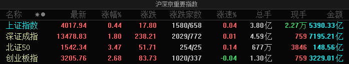 凤凰网财经讯 11月13日,市场早盘震荡走强,截至午间收盘,沪指涨0.44%,深成指涨1.8%,创业板指 涨2.68%。沪深两市半日成交额1.26万亿,较上个交易日放量11亿。 | | | | | 沪深京重要指数 | | | | | --- | --- | --- | --- | --- | --- | --- | --- | | 名称 *● | 最新 | 张幅% | | 涨跌 | 总手 | 现手 | 金额 | | 上证指数 | 4017.94 | 0.44 | 17.80 | 1580/658 | 3.80 7 0.04 | | 2.27万 5390.33亿 | | 深证成指 | 13478.83 | 1.80 | 238.21 | 2029/772 | 0.01 4.59 7 | | 759 7195.21 7. | | 北证50 | 1542.34 | 3.47 | 51.71 | 254/25 | 0.14 6777 | | 3846 148.56 乙 | | 创业板指 | 3205.76 | 2.68 | 83.73 | 1020/337 | -0.04 1.30 7. | | 759 3229.0 ...