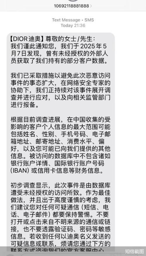5月12日晚,全球知名奢侈品牌迪奥向中国用户发布紧急通知,证实其客户数据库遭遇未经授权的外部访问,部分中国用户个人信息被泄 露。 5月13日上午,南都·湾财社记者在社交平台上搜索发现,不少网友晒出迪奥客户信息泄露的提示短信截图,有网友表示疑惑,"发生了什 么事",也有网友则表达了对个人隐私泄露的担忧。 5月13日,南都·湾财社记者致电迪奥客服中心热线。迪奥相关工作人员表示,"我们于2025年5月7日发现,曾有未经授权的外部人员获取 了我们持有的部分客户数据。" 初步调查显示,此次事件是由数据库遭 受未经授权的访问所致。作为最佳做法, 并且出于高度谨慎的考虑,我们建议您 对任何可疑通信(短信、电话、电子邮 件)都要保持警惕。不要打开或点击来 自不明来源的通信或链接,也不要透露 验证码、密码等敏感信息。若收到任何 以迪奥名义发送的可疑信息或联系,烦 请您通过下方的联系方式咨询我们的官 方客服中心。 保护您的个人信息始终是迪奥的首要事 项。如有任何疑问,请随时与我们联 系。我们非常重视与您的关系,对于此 事给您带来的任何不便及困扰,我们深 表歉意。 根据目前调查进展,在中国收集的受影响的客户个人信息的最大范围可能包 ...