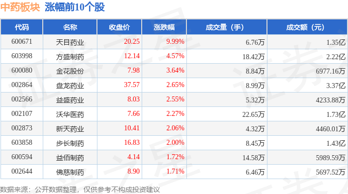 | 代码 | 名称 | 收盘价 | 涨跌幅 | 成交量(手) | 成交额(元) | | --- | --- | --- | --- | --- | --- | | 300391 | *ST长药 | 0.44 | -18.52% | 80.35万 | 3755.51万 | | 002317 | 众生药业 | 21.67 | -1.95% | 79.70万 | 17.45亿 | | 002424 | ST百灵 | 4.27 | -1.39% | 28.70万 | 1.24亿 | | 300147 | ST香雪 | 9.08 | -1.30% | 7.84万 | 7117.68万 | | 920266 | 生物谷 | 9.36 | -1.27% | 1.07万 | 1002.85万 | | 300158 | 振东制药 | 6.08 | -0.65% | 17.81万 | 1.09亿 | | 600422 | 昆药集团 | 12.82 | -0.62% | 6.94万 | 8895.05万 | | 600436 | 片仔瘦 | 167.82 | -0.52% | 2.31万 | 3.87亿 | | 002349 | ...