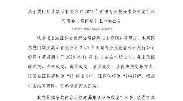 11月25日,上交所发布关于厦门翔业集团有限公司2025年面向专业投资者公开发行公司债券(第四期) 上市的公告。 来源:市场资讯 依据《上海证券交易所公司债券上市规则》等规定,上交所同意厦门翔业集团有限公司2025年面向专业 投资者公开发行公司债券(第四期)于2025年11月26日起在上交所上市,并采取匹配成交、点击成交、 询价成交、竞买成交、协商成交交易方式。该债券证券简称为"25翔业04",证券代码为"244196"。根据 中国结算规则,可参与质押式回购。 ...