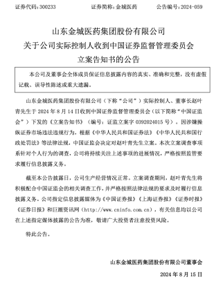 10月9日晚,金城医药(300233.SZ)发布公告,公司实际控制人、董事长赵叶青收到中国证监会重新下发的行政处罚 事先告知书(以下简称《告知书》)。 《告知书》拟决定如下:赵叶青、王震、刘峰构成操纵证券市场的违法行为。依据《证券法》相关规定,赵叶青、王 震、刘峰被处以300万元罚款,其中赵叶青承担150万元,王震承担120万元,刘峰承担30万元。赵叶青被采取4年市场 禁入措施;对王震采取3年市场禁入措施。 作为国内医药中间体领域的知名企业,山东金城医药股份有限公司(以下简称"金城医药"300233.SZ)的治理风波从立 案调查到拟处罚落地,历时一年多。 2024年8月,金城医药发布公告称,公司实际控制人、董事长赵叶青因涉嫌操纵证券市场违法违规行为,收到中国证 监会下发的《山东金城医药集团股份有限公司关于公司实际控制人收到中国证券监督管理委员会立案告知书的公 告》。值得注意的是,立案消息披露前几日,金城医药另一实控人、赵叶青之父赵鸿富刚完成减持操作,于2024年8 月5日至12日减持299.95万股,均价14.39元,合计套现超4000万元。 齐鲁晚报·齐鲁壹点 记者 牟静萍 实习生 袁垚鑫 为及时有效监测企 ...