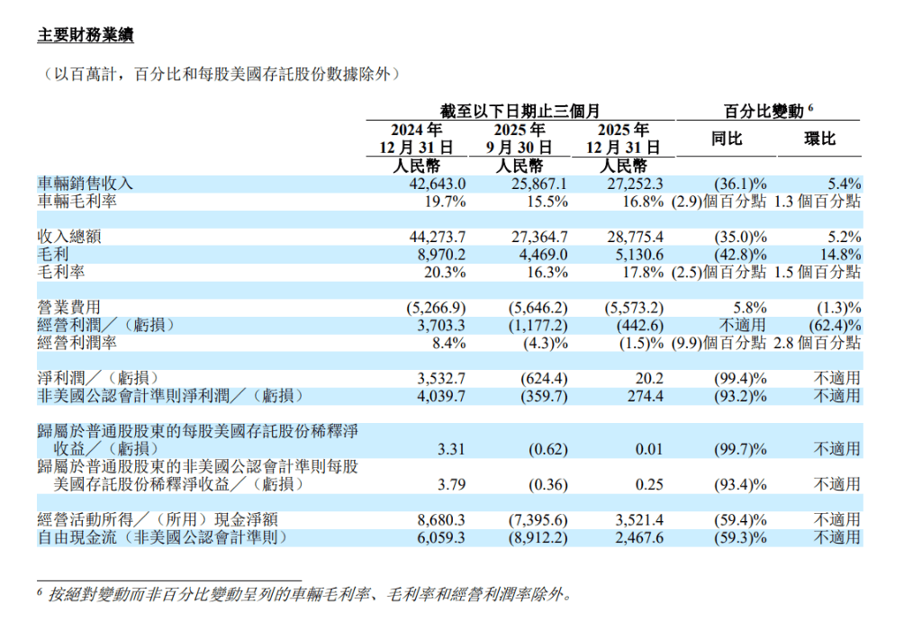 核心观点 - 理想汽车2025年第四季度及全年财务表现显著恶化,营收、利润、交付量等多项核心指标同比大幅下滑,公司给出的2026年第一季度营收指引也远低于市场预期 [1][2][3] - 尽管短期业绩承压,但公司第四季度毛利率环比有所修复,自由现金流转正,且资产负债表保持稳健,拥有逾千亿元人民币的现金储备以支持未来战略 [2][3][4] - 为应对增长瓶颈,公司将增长希望寄托于2026年第二季度开始的新产品周期(如全新理想L9)及生态扩展 [4][5] 2025年第四季度财务表现 - **营收大幅下滑**:第四季度总收入为287.8亿元人民币,同比下降35.0% [1][2]。车辆销售收入为273亿元人民币,同比下降36.1% [2][3] - **盈利能力急剧恶化**:第四季度净利润为2020万元人民币,同比大幅下降99.4% [1][3]。按非美国通用会计准则计算,净利润为2.74亿元人民币,同比下降93.2% [1][3]。调整后每ADS收益为0.25元,上年同期为3.79元 [1] - **经营陷入亏损**:第四季度经营亏损为4.43亿元人民币,经营利润率为-1.5%,而上年同期为经营利润37亿元人民币 [1][3] - **毛利率环比改善**:第四季度车辆毛利率为16.8%,低于上年同期的19.7%,但较第三季度的15.5%有所回升 [1][2][3]。整体毛利率为17.8%,低于上年同期的20.3%,但高于第三季度的16.3% [1][3] - **现金流状况好转**:第四季度经营活动所得现金净额为35.2亿元人民币,自由现金流为24.7亿元人民币,均由第三季度的负值转正 [1][2][3] 2025年全年财务表现 - **交付量与营收收缩**:2025年全年总交付量为40.63万辆,同比下滑逾18% [3]。全年总收入为1123亿元人民币,同比减少22.3% [3][4] - **全年利润大幅缩水**:2025年全年净利润为11.4亿元人民币,较2024年的80.5亿元下降85.8% [3]。非美国公认会计准则下净利润为24亿元人民币,同比下滑77.5% [3][4] - **全年由盈转亏**:2025年全年录得经营亏损5.21亿元人民币,而上年度为经营利润70亿元人民币 [4] - **毛利率收窄**:2025年全年整体毛利率为18.7%,较2024年的20.5%收窄 [4] - **自由现金流为负**:2025年全年自由现金流为负128亿元人民币 [4] - **现金储备雄厚**:截至2025年12月31日,公司现金、现金等价物及受限制现金等达到1012亿元人民币 [4] 2026年第一季度业绩指引 - **营收指引低于预期**:公司预计第一季度营收介于204亿元至216亿元人民币之间,同比缩减16.7%至21.3%,远低于市场此前预估的240.1亿元 [1][5] - **交付量指引符合预期**:预计第一季度交付量为85000至90000辆,同比减少3.1%至8.5%,与市场预估的87609辆大体相符 [1][5] - **年初交付数据**:2026年1月和2月分别交付了2.76万辆和2.64万辆汽车 [5] 公司未来战略与展望 - **聚焦新产品周期**:公司正将重心转向新一轮产品周期,全新理想L9将于2026年第二季度上市,预计在动力系统、智能驾驶和底盘技术上全面升级 [5] - **生态扩展与全球拓展**:公司计划利用强劲的现金储备把握具身智能领域的机遇并加速全球拓展 [4]