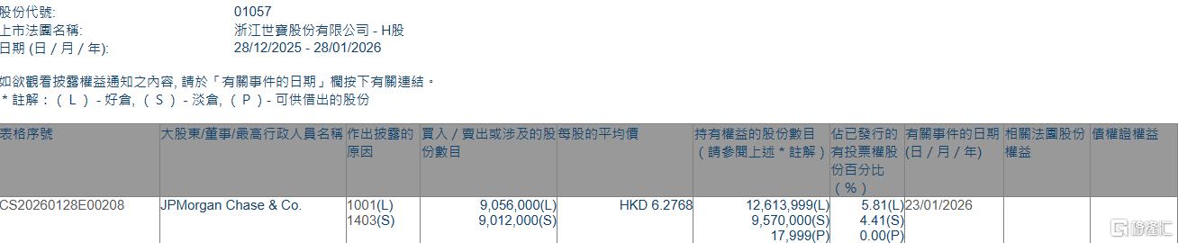 | | | 種作出張廢的 冒入 / 曹出或涉及的股每股的平均 | | | | 佔已發行的 有關事件的日 | | --- | --- | --- | --- | --- | --- | --- | | | | | | | 請參閱上述*註解)在投票權股(日/月/年) | | | | | | | | | 份自分可 | | CS20260128E00208 | JPMorgan Chase & Co. | 1001(L) | 9,056,000(L) | HKD 6.2768 | 12,613,999(L | 5.81(L)23/01/2026 | | | | 1403(S) | 9,012,000(S) | | 9,570,000(S) | 4.41(S) | | | | | | | 17,999(P) | 0.00(P) | | 股份代號: | 01057 | | --- | --- | | 上市法國名稱: | 浙江世寶股份有限公司 | | 日期 (日 / 月 / 年): | 28/12/2025 - 28/01/202 | 格隆汇1月28日丨根据联交所最新权益披露资料显示,2026年1月23日,浙江世宝(010 ...