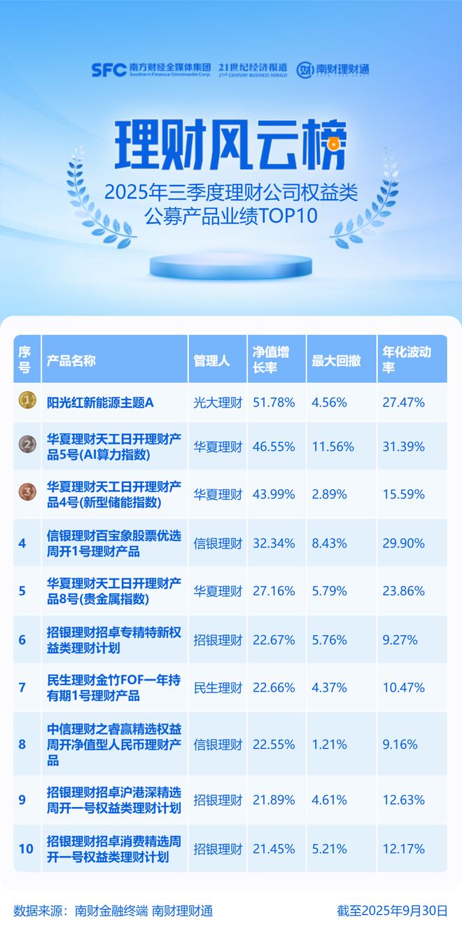 市场整体表现 - 2025年第三季度A股市场表现强劲,创业板指大涨超50%,上证指数和深证成指分别累计上涨12.73%和29.25%,创下自2019年4月以来最高单季度涨幅 [4] - 市场交易量大幅活跃,三季度A股总成交金额达139.24万亿元,前三季度累计成交金额301.92万亿元,超过2021年全年257.28万亿元的纪录 [6] - 分行业看,TMT相关行业表现亮眼,通信、电子、电力设备、有色金属四个行业涨幅居前,均超过40% [6] 权益类理财产品表现 - 理财公司权益类公募理财产品在三季度净值增长率均值为16.02%,其中12只产品净值增长率超过20% [7] - 在40只样本产品中,仅光大理财的“阳光红300红利增强”产品录得负收益,净值增长率为-1.6% [7] - 本期榜单中,华夏理财和招银理财各有3只产品上榜,信银理财有2只产品上榜 [7] 高收益产品分析 - 三季度收益领先的产品具有强行业属性,押注新能源、AI算力、新型储能的产品位列榜单前三,涨幅均超40% [8] - 具体来看,阳光红新能源主题A、华夏理财天工日开理财产品5号(AI算力指数)、华夏理财天工日开理财产品4号(新型储能指数)的净值增长率分别为51.78%、46.55%和43.99% [8] - 华夏理财“天工日开理财产品5号(AI算力指数)”为PR5级高风险产品,年化波动率超过31%,其权益类投资穿透后占资产比例为94.33% [8] - 该产品前五大重仓股为海光信息、中芯国际、长电科技、芯原股份、通富微电,占总资产比例均超过6%,这些个股三季度均涨超30%,其中芯原股份大涨近90% [8] 特定产品配置策略 - “百宝象股票优选周开1号”产品配置相对分散,其资产配置包括权益类资产(52.60%)、公募基金、现金(32.27%)及银行存款(14.62%) [9] - 该产品前十项资产包括IP经济龙头泡泡玛特(5.11%)、A股游戏龙头巨人网络(4%)以及投资于数字经济、黄金、金融科技、银行等方向的基金 [9]