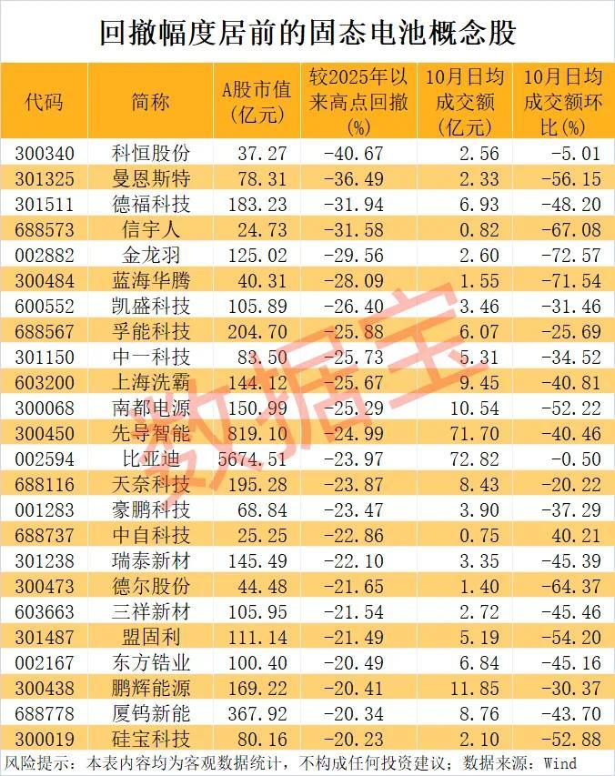 固态电池概念股年内表现 - 截至10月17日,今年以来共20只固态电池概念股累计涨幅超过50%,其中4只股票涨幅翻倍,分别是上海洗霸、先导智能、德福科技、中一科技 [1] 近期股价回撤情况 - 近期A股市场热度下降,多只固态电池概念股出现明显回落,10月17日收盘价与年内高点相比,有24只股票回撤幅度超过20% [1] - 年内翻倍牛股德福科技、中一科技、上海洗霸、先导智能出现在回撤名单中,回撤较大的股票还包括科恒股份、曼恩斯特、信宇人、金龙羽、东方锆业等 [1] 回撤幅度居前的个股数据 - 科恒股份回撤幅度最大,达40.67%,A股市值为37.27亿元,10月日均成交额为2.56亿元,较前期下降5.01% [2] - 曼恩斯特回撤36.49%,A股市值78.31亿元,10月日均成交额2.33亿元,较前期下降56.15% [2] - 德福科技回撤31.94%,A股市值183.23亿元,10月日均成交额6.93亿元,较前期下降48.20% [2] - 信宇人回撤31.58%,A股市值24.73亿元,10月日均成交额0.82亿元,较前期下降67.08% [2] - 金龙羽回撤29.56%,A股市值125.02亿元,10月日均成交额2.60亿元,较前期下降72.57% [2] - 比亚迪回撤23.97%,是列表中A股市值最大的公司,达5674.51亿元,10月日均成交额72.82亿元,较前期微降0.50% [2] - 先导智能回撤24.99%,A股市值819.10亿元,是列表中市值第二大的公司,10月日均成交额71.70亿元,较前期下降40.46% [2]