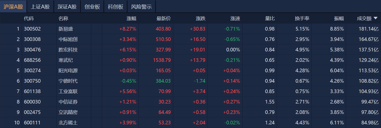 沪指早间震荡走强,再创十年新高,逼近4000点。南财金融终端显示,截至早盘收盘,沪指涨1.04%,深成指涨1.26%,创业板指涨1.54%。 盘面上热点快速轮动,算力硬件方向早盘表现强势,东田微触及20cm涨停,新易盛、汇绿生态、中际旭创盘中均创历史新高; 个股方面,新易盛成交额超181亿元居首,中际旭创、胜宏科技成交额靠前。 可控核聚变概念股反复活跃,东方钽业3天2板创历史新高; | 沪深A股 | 上证A股 | 深证A股 | 创业板 | 科创板 风险警示 | | | | | --- | --- | --- | --- | --- | --- | --- | --- | | | 代码 | 名称 | | 涨幅 | 最新价 | 涨跌 | 涨速 | | 1 | 300502 | 新易盛 | | +8.27% | 403.80 | +30.83 | -0.71% | | 2 | 300308 | 中际旭创 | | +3.34% | 510.50 | +16.50 | -0.65% | | 3 | 300476 | 胜宏科技 | | +6.15% | 327.99 | +19.01 | 0.00% | | 4 | 68 ...