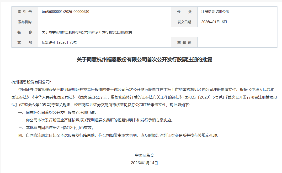 公司上市与融资 - 中国证监会于2026年1月16日同意杭州福恩股份有限公司首次公开发行股票注册[1][2] - 公司计划在深圳证券交易所主板上市[1] - 本次发行的保荐机构为中信证券[1] - 公司计划募集资金总额为12.5亿元人民币[1] 公司业务与定位 - 公司是一家以可持续发展为核心的全球生态环保面料供应商[1] - 主营业务为生态环保面料的研发、生产和销售[1] - 公司已发展成为集面料设计、研发、纺纱、织造、印染、后整理和销售于一体的大型企业[1]