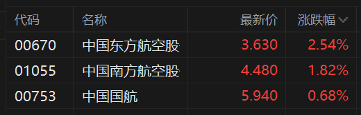 | 代码 | 名称 | 最新价 涨跌幅 v | | --- | --- | --- | | 00670 | 中国东方航空股 | 3.630 2.54% | | 01055 | 中国南方航空股 | 4.480 1.82% | | 00753 | 中国国航 | 5.940 0.68% | 此外据悉,2025年冬春航季将于10月26日启动,多家航空公司已公布新增航线计划,例如华夏航空新增 5条航线,中国国航新开3条航线。这为行业带来新的增长预期。(格隆汇) 消息上,10月15日晚,多家航空公司发布9月运营数据。数据显示,三大航司的客运运力投入、旅客周 转量、客座率等客运主要运营数据同比均呈上升态势。华泰证券认为票价同比转正有望在4Q延续,同 时油价下跌有望降低航司成本压力,共同改善航司盈利,并催化板块关注度。 港股三大航空股继续上涨行情,其中,中国东方航空涨2.5%,3日连涨超15%,中国南方航空涨近2%, 中国国航涨约1%。 ...