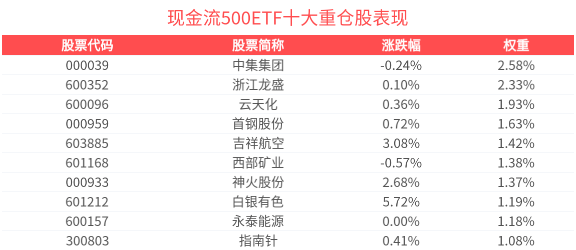 截至2025年10月17日9:50,中证500自由现金流指数上涨0.47%,成分股白银有色、吉祥航空、神火股份、天山铝业、海澜之家等领涨。现金流 500ETF(560120)上涨1.31%,最新价报1.16元。 从收益能力看,截至2025年10月16日,现金流500ETF自成立以来,最高单月回报为7.97%,最长连涨月数为2个月,最长连涨涨幅为12.37%,涨跌月数比为 2/0,上涨月份平均收益率为6.02%,月盈利百分比为100%,月盈利概率为100%。 现金流500ETF紧密跟踪中证500自由现金流指数,中证500自由现金流指数从中证500指数样本中选取50只自由现金流率较高的上市公司证券作为指数样本, 以反映中证500指数样本中现金流创造能力较强的上市公司证券的整体表现。 | 股票代码 | 股票简称 | 涨跌幅 | 权重 | | --- | --- | --- | --- | | 000039 | 中集集团 | -0.24% | 2.58% | | 600352 | 浙江龙盛 | 0.10% | 2.33% | | 600096 | 云天化 | 0.36% | 1.93% | | 000959 | 首钢 ...