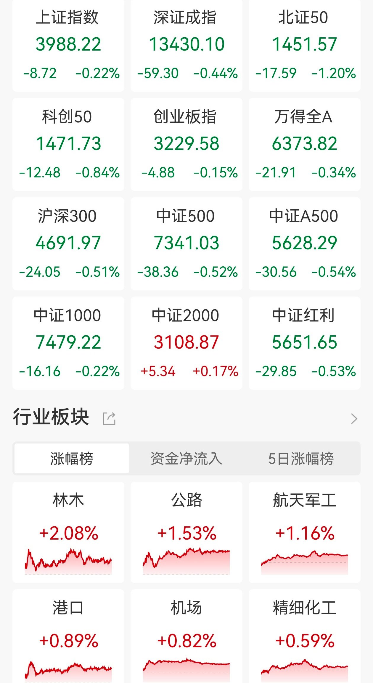| 涨幅榜 | 资金净流入 | 5日涨幅* | | --- | --- | --- | | 林木 | 公路 | 航天军_ | | +2.08% | +1.53% | +1.16° | | A. And V Mandat | | | | 港口 | 机场 | 精细化 | | +0.89% | +0.82% | +0.599 | | 上证指数 | 深证成指 | 北证5( | | --- | --- | --- | | 3988.22 | 13430.10 | 1451.5 | | -8.72 -0.22% -59.30 -0.44% -17.59 -1 | | | | 科创50 | 创业板指 | 万得全/ | | 1471.73 | 3229.58 | 6373.8 | | -12.48 -0.84% -4.88 -0.15% -21.91 -0 | | | | 沪深300 | 中证500 | 中证A5( | | 4691.97 | 7341.03 | 5628.2 | | -24.05 -0.51% -38.36 -0.52% -30.56 -0 | | | | 中证1000 | 中证2000 | 中证红 | | ...