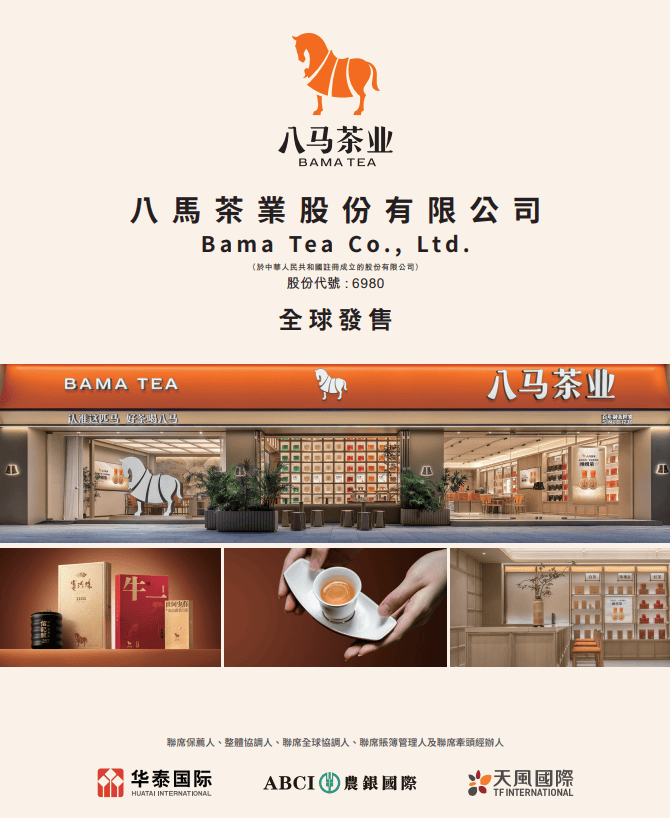 公司IPO发行概况 - 公司拟全球发售900万股H股,其中香港发售90万股,国际发售810万股 [2] - 招股期为2025年10月20日至10月23日,预期定价日为10月24日,股份预计于2025年10月28日开始在联交所买卖 [2] - 发售价区间为每股45.00-50.00港元,每手买卖单位为100股,联席保荐人为华泰国际、农银国际及天风国际 [2] 市场地位与行业概况 - 按2024年高端茶叶销售收入计,公司位居全国第一,按截至2024年12月31日茶叶连锁专卖店数量计,在中国茶叶供应商中排名第一 [3] - 在乌龙茶和红茶市场按2024年销售收入计排名第一,铁观音销售收入连续10余年全国第一,武夷岩茶销售收入连续5年第一,红茶销售收入连续4年第一 [3] - 中国高端茶叶市场规模由2020年的约890亿元增长至2024年的约1,031亿元,复合年增长率约为3.7%,预计2029年达到约1,353亿元,2024至2029年复合年增长率约5.6% [3] - 中国高端茶叶市场前五大企业总市场份额由2020年的约5.5%增长至2024年的约5.6%,公司市场份额由2020年的约1.1%提升至2024年的约1.7% [3] - 中国茶叶市场竞争格局高度分散,2024年从事茶叶种植、生产及分销的茶企超过160万家,前五大市场参与者仅占约2.4%的市场份额,销售收入合计约82.02亿元 [8] 财务业绩表现 - 收入由2022年度的18.18亿元增长至2023年度的21.22亿元,再增长至2024年度的21.43亿元 [7] - 2025年上半年收入为10.63亿元,较2024年同期的11.10亿元有所减少 [7] - 利润及全面收入总额由2022年度的1.66亿元增长至2023年度的2.06亿元,再增长至2024年度的2.24亿元 [7] - 2025年上半年利润为1.20亿元,较2024年同期的1.46亿元有所减少 [7] - 净利润率由2022年度的9.1%提升至2023年度的9.7%,再提升至2024年度的10.5%,但2025年上半年净利润率由去年同期的13.2%下降至11.3% [7] 业务运营与门店网络 - 线下门店总数由2022年1月1日的2,613家增至2025年6月30日的3,585家,其中加盟门店由2,203家增至3,341家 [5] - 截至最后实际可行日期,公司拥有3,633家线下门店,分布为一线城市396家、新一线城市755家、二线城市1,039家、三线及其他城市1,443家 [5] - 公司拥有安溪和武夷山两个茶叶精制生产基地,配备高度自动化的生产线,其中武夷山第七代生产线为数字化及信息化生产线,安溪第六代生产线曾获中国茶科技创新大赛特等奖 [8] 品牌与产品体系 - 公司拥有覆盖中国六大茶类的全品类茶产品体系核心品牌八马,该品牌自2010年起被认定为"中国驰名商标" [8] - 信记号子品牌专注高端年份普洱茶,并于2024年被认定为中华老字号,万山红子品牌专注于迎合年轻消费者及女性消费者的高质价比产品 [8] 资金用途与未来展望 - 按发售价中位数每股47.5港元计算,全球发售预计所得款项净额约3.682亿港元 [9] - 所得款项约35%用于扩建生产基地,约20%用于提升品牌价值及扩大产品组合,约15%用于直营门店网络扩张,约10%用于提升业务运营数字化水平,约10%用于行业收购或投资,约10%用作营运资金 [9] - 预计线下高端茶叶市场规模将增长至约1,287亿元,2024年至2029年复合年增长率约5.7% [9]