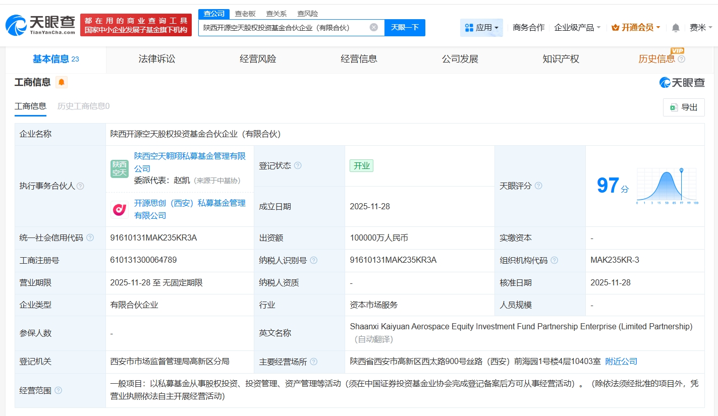 | | 草公司 6在用的商业查询工具 | 童老板 音关系 音风险 | | | | | --- | --- | --- | --- | --- | --- | | | 中小企业发展子其全旗下机构 | 陕西开源空天股权投资基金合伙企业(有限合伙) | × 天眼一下 | 品应用 ▼ | 商务合作 | | 基本信息 23 | 法律诉讼 | 经营风险 | 经营信息 | 公司发展 | 知 | | 工商信息 ● | | | | | | | 工商信息 历史工商信息0 | | | | | | | 企业名称 | 陕西开源空天股权投资基金合伙企业(有限合伙) | | | | | | 执行事务合伙人 2 | 陕西空天飘翔私募基金管理有限 19579 公司 委派代表:赵凯(来源于中墓协) | 登记状态 2 | 开业 | | 天眼评分 2 | | | 开源思创(西安)私募基金管理 有限公司 | 成立日期 | 2025-11-28 | | | | 统一社会信用代码 0 | 91610131MAK235KR3A | 出资额 | 100000万人民币 | | 实缴资本 | | 工商注册号 | 610131300064789 | 纳税人识别号 ...