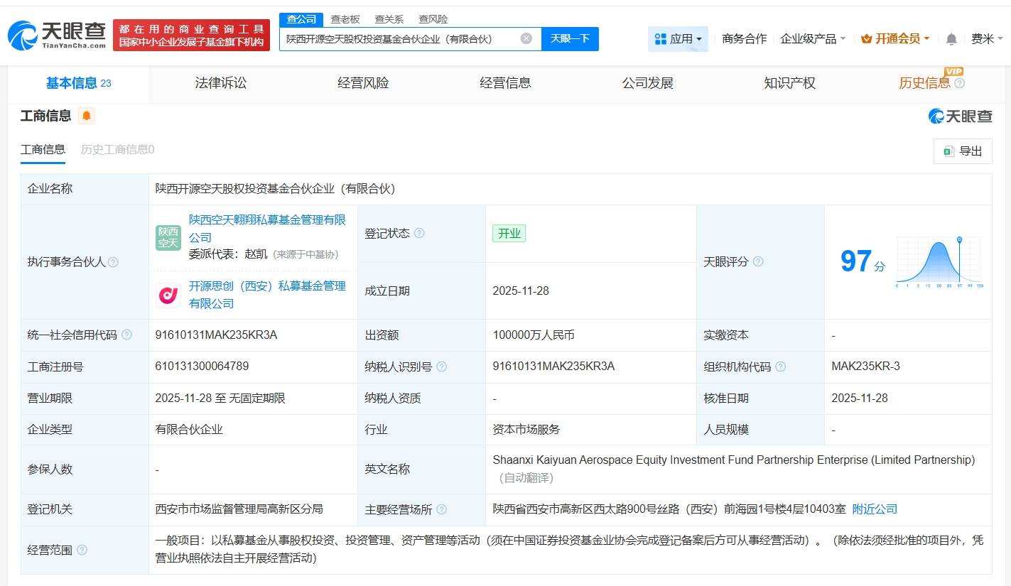 陕西开源空天股权投资基金登记成立 出资额10亿
