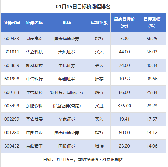 券商评级概览 - 1月15日,券商共发布9次上市公司目标价 [1] - 同日,共有26家上市公司获得券商推荐 [1] 目标价涨幅居前公司 - 冠豪高新目标价涨幅为56.25%,属于造纸行业 [1] - 华立科技目标价涨幅为56.03%,属于文娱用品行业 [1] - 能科科技目标价涨幅为40.34%,属于IT服务行业 [1] 获多家券商推荐公司 - 中信银行获得2家券商推荐 [1] - 东鹏饮料获得2家券商推荐 [1] - 冠豪高新获得1家券商推荐 [1]