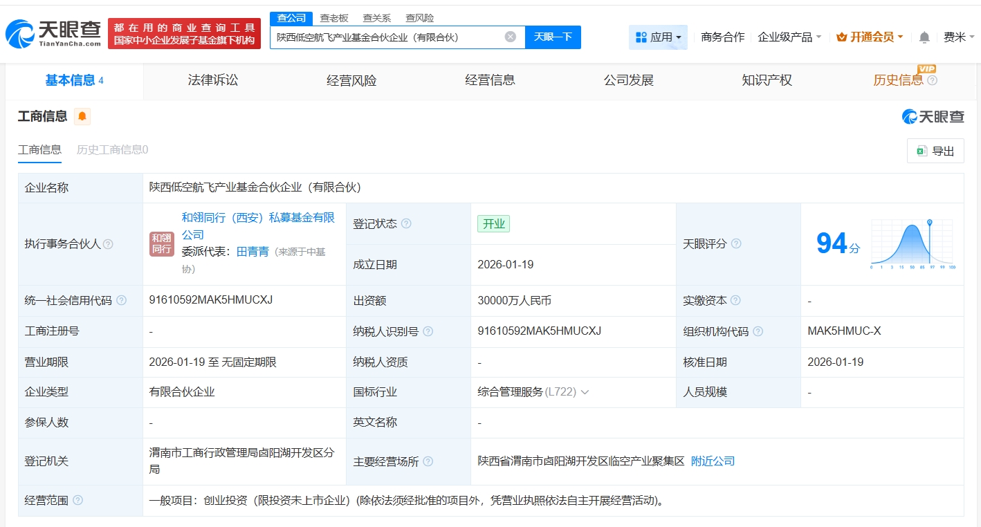 基金设立与基本信息 - 陕西低空航飞产业基金合伙企业(有限合伙)于2026年1月19日成立 [2] - 基金出资额为3亿元人民币(30000万人民币) [1][2] - 基金执行事务合伙人为和翎同行(西安)私募基金有限公司 [1][2] - 基金经营范围为创业投资,限投资未上市企业 [1][2] 出资结构与合伙人 - 基金由四方共同出资设立 [1] - 合伙人包括:陕西省政府投资引导基金合伙企业(有限合伙)(国有独资) [1][3] - 合伙人包括:渭南市工业倍增发展基金(有限合伙)(国有独资) [1][3] - 合伙人包括:和翎同行(西安)私募基金有限公司(私募基金管理人) [1][3] - 合伙人包括:西安和翎航装投资合伙企业(有限合伙)(私募基金) [1][3] 注册与运营信息 - 基金登记机关为渭南市工商行政管理局卤阳湖开发区分局 [2] - 基金主要经营场所位于陕西省渭南市卤阳湖开发区临空产业聚集区 [2] - 基金企业类型为有限合伙企业 [2]
