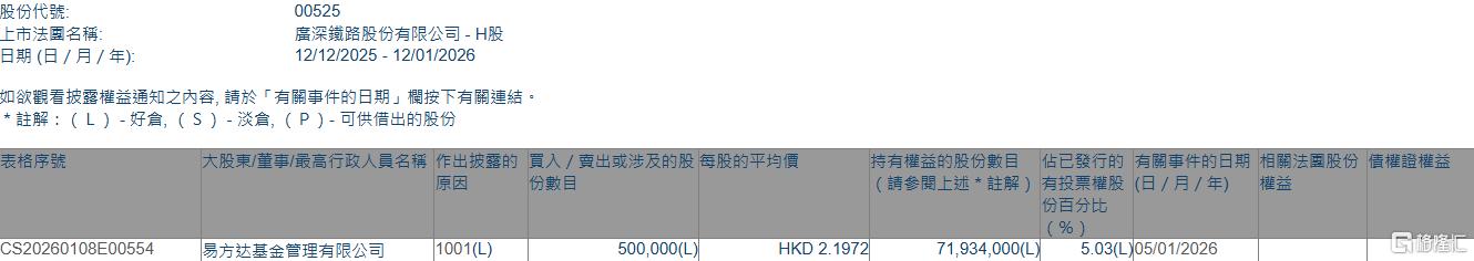 | 表格序號 | 大股東/董事/最高行政人員名稱 作出披露的 買入 / 賣出或涉及的股 每股的平均價 | | | | | 持有權益的股份數目 佔已發行的 有關事件的 | | --- | --- | --- | --- | --- | --- | --- | | | | 周因 | 份數目 | | | (請參閱上述*註解)有投票權股 (日 / 月 / 年 | | | | | | | | 份百分比 | | | | | | | | (%) | | CS20260108E00554 | 易方达基金管理有限公司 | 1001(L) | | 500.000(L | HKD 2.1972 | 71,934,000(L) 5.03(L)05/01/2026 | 增持后,易方达基金管理有限公司最新持股数目为7193.4万股,持股比例由4.99%上升至5.03%。 | 股份代號: | 00525 | | --- | --- | | 上市法國名稱: | 廣深鐵路股份有限公司 - H股 | | 日期 (日 / 月 / 年): | 12/12/2025 - 12/01/2026 | 格隆汇1月12日丨根据联交所最新权益披露资料显示,20 ...