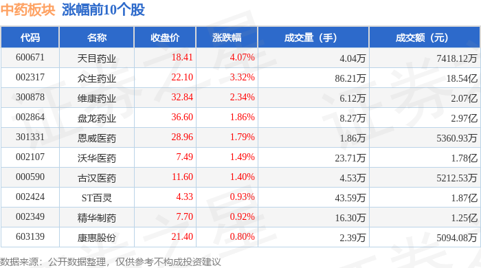 | 代码 | 名称 | 收盘价 | 涨跌幅 | 成交量(手) | 成交额(元) | | --- | --- | --- | --- | --- | --- | | 300391 | *ST长药 | 0.44 | -18.52% | 80.35万 | 3755.51万 | | 002317 | 众生药业 | 21.67 | -1.95% | 79.70万 | 17.45亿 | | 002424 | ST百灵 | 4.27 | -1.39% | 28.70万 | 1.24亿 | | 300147 | ST香雪 | 9.08 | -1.30% | 7.84万 | 7117.68万 | | 920266 | 生物谷 | 9.36 | -1.27% | 1.07万 | 1002.85万 | | 300158 | 振东制药 | 6.08 | -0.65% | 17.81万 | 1.09亿 | | 600422 | 昆药集团 | 12.82 | -0.62% | 6.94万 | 8895.05万 | | 600436 | 片仔瘦 | 167.82 | -0.52% | 2.31万 | 3.87亿 | | 002349 | ...