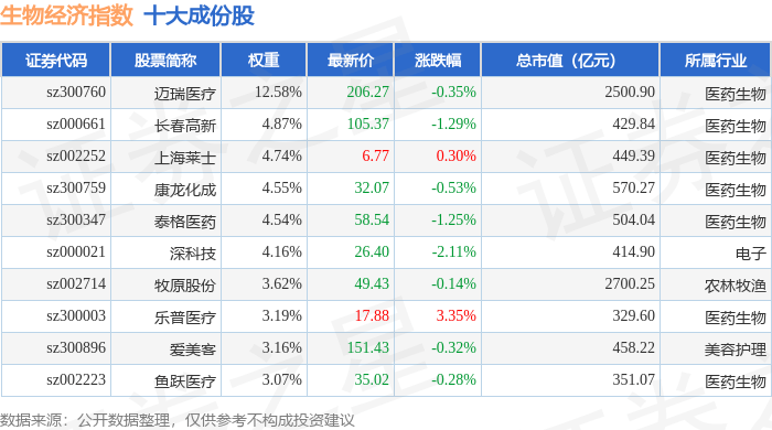 指数整体表现 - 生物经济指数(970038)报收2230.23点,单日下跌0.35% [1] - 指数成交额为174.44亿元,换手率为1.2% [1] - 指数成份股中23家上涨,26家下跌,乐普医疗以3.35%涨幅领涨,我武生物以2.73%跌幅领跌 [1] 十大权重成份股详情 - 迈瑞医疗权重最高为12.58%,总市值2500.90亿元,股价下跌0.35% [1] - 牧原股份总市值最高为2700.25亿元,权重3.62%,股价微跌0.14% [1] - 乐普医疗为当日涨幅最大权重股,上涨3.35%,权重3.19%,总市值329.60亿元 [1] - 十大权重股中多数属于医药生物行业,深科技属电子行业,牧原股份属农林牧渔行业,爱美客属美容护理行业 [1] 市场资金流向 - 指数成份股整体主力资金净流出5.32亿元 [3] - 游资资金净流入827.83万元,散户资金净流入5.24亿元 [3] - 迈瑞医疗主力资金净流入6522.11万元,净占比4.20%,但游资净流出6065.39万元 [3] - 牧原股份主力资金净流入4348.61万元,净占比3.65% [3] - 大北农主力资金净流入3043.17万元,净占比达11.51% [3] - 鱼跃医疗主力资金净流入2267.57万元,净占比10.30% [3]