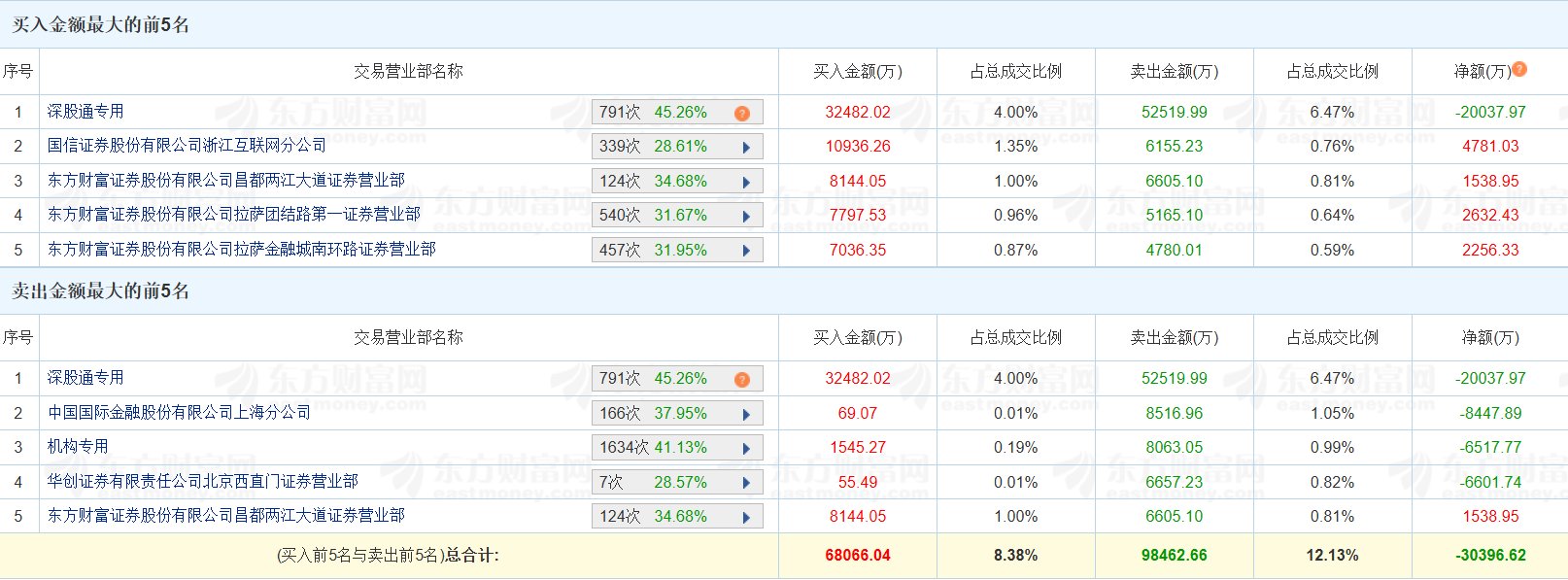 | 序号 | 交易营业部名称 | | 买人金额(万) | 占总成交比例 | | --- | --- | --- | --- | --- | | | 深股通专用 | 791次 45.26% 2 | 32482.02 | 4.00% | | 2 | 中国国际金融股份有限公司上海分公司 | 166次 37.95% | 69.07 | 0.01% | | 3 | 机构专用 | 1634次 41.13% | 1545.27 | 0.19% | | ব | 华创证券有限责任公司北京西直门证券营业部 | 7次 28.57% | 55.49 | 0.01% | | 5 | 东方财富证券股份有限公司昌都两江大道证券营业部 | 124次 34.68% | 8144.05 | 1.00% | | | (买入前5名与卖出前5名)总合计: | | 68066.04 | 8.38% | | 序号 | 交易营业部名称 | | 买入金额(万) | 占总成交比例 | | --- | --- | --- | --- | --- | | | 深股通专用 | 791次 45.26% 2 | 32482.02 | 4.00% | | 2 | 国信证券 ...