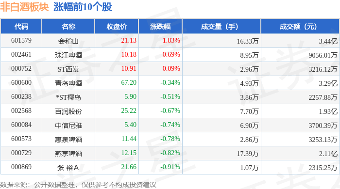 证券之星消息,10月13日非白酒板块较上一交易日下跌0.43%,*ST兰黄领跌。当日上证指数报收于 3889.5,下跌0.19%。深证成指报收于13231.47,下跌0.93%。非白酒板块个股涨跌见下表: | 代码 | 名称 | 收盘价 | 涨跌幅 | 成交量(手) | 成交额(元) | | --- | --- | --- | --- | --- | --- | | 601579 | 会稽山 | 21.13 | 1.83% | 16.33万 | 3.44亿 | | 002461 | 珠江啤酒 | 10.18 | 0.69% | 8.95万 | 9056.01万 | | 000752 | ST西发 | 10.91 | 0.09% | 2.96万 | 3216.12万 | | 600600 | 顾智郎恤 | 67.20 | -0.34% | 4.93万 | 3.29亿 | | 600238 | *ST椰岛 | 5.90 | -0.51% | 3.86万 | 2257.88万 | | 002568 | 百润股份 | 25.22 | -0.67% | 7.70万 | 1.93亿 | | 600084 | 中信尼雅 | ...