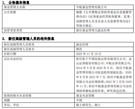 | 新任高级管理人员职务 | 副总经理 | | --- | --- | | 新任高级管理人员姓名 | 韩浩 | | 任职日期 | 2025年11月19日 | | 过往从业经历 | 曾任职于中国民族证券有限责任公司、金 | | | 元证券股份有限公司、中航证券有限公司: | | | 2016年9月至2020年8月,担任中航基 | | | 金管理有限公司权益投资部副总监:2020 | | | 年8月至2023年7月,担任中航基金管理 | | | 有限公司总经理助理:2023年7月至2025 | | | 年11月,担任中航基金管理有限公司总经 | | | 理助理兼权益投资部、研究部总经理。 | | 取得的相关从业资格 | 基金从业资格 | | 国籍 | 中国 | | 学历、学位 | 硕士研究生、硕士 | (责任编辑:康博) 中国经济网北京11月21日讯 昨日,中航基金公告,任命韩浩为副总经理。 韩浩曾任职于中国民族证券有限责任公司、金元证券股份有限公司、中航证券有限公司;2016年9 月至2020年8月担任中航基金管理有限公司权益投资部副总监;2020年8月至 2023年7月,担任中航基金 管理有限公司总经理助理; ...