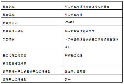 中国经济网北京11月21日讯 今日,平安基金公告,苏宁离任平安惠享纯债。 苏宁曾先后担任易方达基金管理有限公司固定收益交易员、固定收益研究员兼基金经理助理。2019 年6月加入平安基金管理有限公司,任固定收益投资中心投资经理,2019年12月25日起任基金经理。 平安惠享纯债A/C/D成立于2016年10月27日、2020年4月23日、2024年8月20日,截至2025年11月20 日,其今年来收益率为2.51%、2.19%、2.57%,成立来收益率为35.36%、12.31%、4.31%,累计净值为 1.3225元、1.1544元、1.1771元。 | 基金名称 | 平安惠享纯债债券型证券投资基金 | | --- | --- | | 基金简称 | 平安惠享纯债 | | 基金主代码 | 003286 | | 基金管理人名称 | 平安基金管理有限公司 | | 公告依据 | 《公开募集证券投资基金信息披露管理办 | | | 法》 | | 基金经理变更类型 | 解聘基金经理 | | 新任基金经理姓名 | | | 共同管理本基金的其他基金经理姓名 | 张文平、田元强 | | 离任基金经理姓名 | 苏宁 | (责任编辑 ...