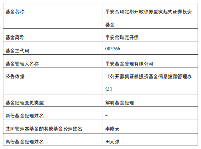 中国经济网北京11月21日讯 近日,平安基金公告,田元强离任平安合瑞定开债、平安惠合纯债。 平安惠合纯债成立于2019年12月18日,截至2025年11月20日,其今年来收益率为1.19%,成立来收 益率为21.28%,累计净值为1.2056元。 | 基金名称 | 平安合瑞定期开放债券型发起式证券投资 | | --- | --- | | | 基金 | | 基金简称 | 平安合瑞定开债 | | 基金主代码 | 005766 | | 基金管理人名称 | 平安基金管理有限公司 | | 公告依据 | 《公开募集证券投资基金信息披露管理办 | | | 法》 | | 基金经理变更类型 | 解聘基金经理 | | 新任基金经理姓名 | - | | 共同管理本基金的其他基金经理姓名 | 李晓天 | | 高任基金经理姓名 | 田元强 | | 基金名称 | 平安惠合纯债债券型证券投资基金 | | --- | --- | | 基金简称 | 平安惠合纯债 | | 基金主代码 | 007196 | | 基金管理人名称 | 平安基金管理有限公司 | | 公告依据 | 《公开募集证券投资基金信息披露管理办 | | | 法》 | | 基金经理 ...