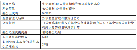 安信鑫利30天持有债券A/C成立于2025年9月2日。 | 基金名称 | 安信鑫利30天持有期债券型证券投资基金 | | --- | --- | | 基金简称 | 安信鑫利 30天持有债券 | | 基金主代码 | 023653 | | 基金管理人名称 | 安信基金管理有限责任公司 | | 公告依据 | 《公开募集证券投资基金信息披露管理办法》、《基金管理公司投资 | | | 管理人员管理指导意见》等 | | 基金经理变更类型 | 增聘基金经理 | | 新任基金经理姓名 | 宛晴 | | 共同管理本基金的其他基 | 张幸 | | 金经理姓名 | | 中国经济网北京11月21日讯近日,安信基金公告,安信鑫利30天持有债券增聘宛晴。 宛晴历任东兴证券股份有限公司资产管理业务总部交易员、交易主管、投资经理助理,现任安信基金管 理有限责任公司固定收益部基金经理。 ...
