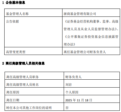 中国经济网北京11月21日讯 昨日,浙商基金公告,财务负责人刘岩因个人原因离任。 | 基金管理人名称 | 浙商基金管理有限公司 | | --- | --- | | 公告依据 | 《证券基金经营机构董事、监事、高级 | | | 管理人员及从业人员监督管理办法》、 | | | 《公开募集证券投资基金信息披露管 | | | 理办法》 | | 高管变更类型 | 离任基金管理公司财务负责人 | | 离任高级管理人员职务 | 财务负责人 | | --- | --- | | 离任高级管理人员姓名 | 刘岩 | | 离任原因 | 个人原因 | | 离任日期 | 2025 年 11 月 18 日 | | 转任本公司其他工作岗位的说明 | 否 | (责任编辑:康博) ...