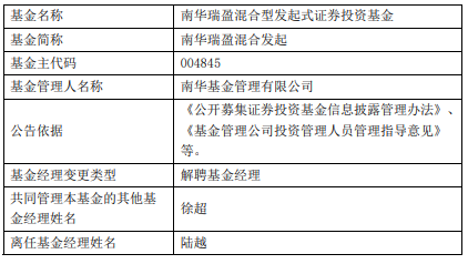 | 基金名称 | 南华瑞盈混合型发起式证券投资基金 | | --- | --- | | 基金简称 | 南华瑞盈混合发起 | | 基金主代码 | 004845 | | 基金管理人名称 | 南华基金管理有限公司 | | 公告依据 | 《公开募集证券投资基金信息披露管理办法》 1 《基金管理公司投资管理人员管理指导意见》 | | | 等。 | | 基金经理变更类型 | 解聘基金经理 | | 共同管理本基金的其他基 | 徐韶 | | 金经理姓名 | | | 离任基金经理姓名 | 陆越 | 徐超曾在鹏扬基金管理有限公司从事投资研究相关工作,担任鹏扬基金管理有限公司投资经理,2006年 7月至2008年11月于中美大都会人寿保险有限公司顾问行销市场部担任高级助理;2008年11月至2012年9 月于中诚信国际信用评级有限责任公司金融机构评级部担任总经理助理、高级分析师;2012年9月至 2015年6月于泰达宏利基金管理有限公司固定收益部担任高级研究员;2015年6月至2015年11月于方正富 邦基金管理有限公司基金投资部担任基金经理、基金经理助理。2024年6月入职南华基金管理有限公 司,历任南华基金管理有限公司权益投资 ...