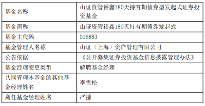 中国经济网北京11月21日讯近日,山证(上海)资产管理有限公司公告,严撼离任山证资管裕享增强债券 发起式、山证资管裕鑫180天持有期债券发起式。 严撼2014年7至2020年9月任中银基金固定收益投资部固收研究员。2020年10月加入山西证券资管固收部 任投资经理助理,2021年9月任山西证券公募基金部基金经理助理,2022年8月起任基金经理。 山证资管裕享增强债券发起式A/C成立于2022年4月29日,截至2025年11月20日,其今年来收益率为 5.16%、4.80%,成立来收益率为15.16%、13.60%,累计净值为1.1516元、1.1360元。山证资管裕享增强 债券发起式E成立于2025年3月31日,成立来收益率为-1.60%,累计净值为1.0826元。 山证资管裕鑫180天持有期债券发起式A/C成立于2023年3月8日,截至2025年11月20日,其今年来收益 率为3.19%、2.81%,成立来收益率为8.43%、7.25%,累计净值为1.0843元、1.0725元。 | 基金名称 | 山证资管裕鑫180天持有期债券型发起式证券投 | | --- | --- | | | 资基金 | | 基金简称 ...